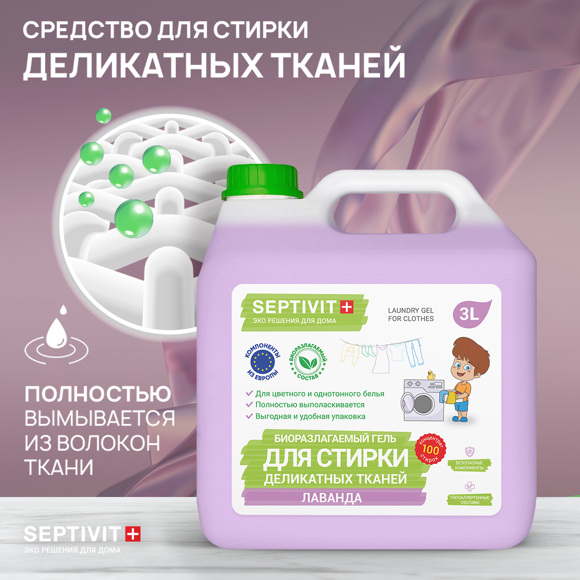 ГЕЛЬ ДЛЯ СТИРКИ SEPTIVIT Premium объемом 3 литра (3000 мл.). Гель - идеальная форма средства для стирки белья. При его использовании не отмечается разводов, которые нередко наблюдаются в случае применения обычного стирального порошка. Жидкость во время чи