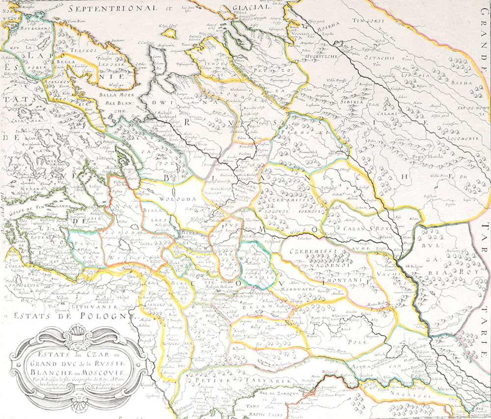 Географическая карта конца XVII века "Государство Царя и Великого князя Белой Руси и Московии" (Estats du Czar ou Grand duc de la Russie Blanche ou Moscovie). Издание "N. Sanson le fils. Geographe de Roy". Размер карты: 40.5 х 48 см. Размер листа: 46 х 6