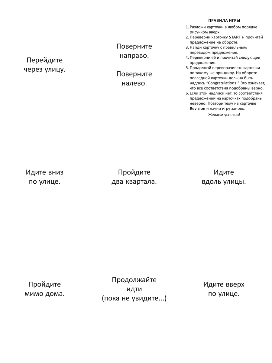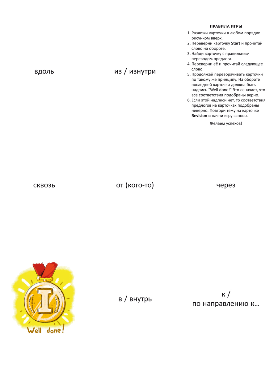 Пособие содержит 6 комплектов разрезных иллюстрированных карточек, которые помогут учащимся в игровой форме интересно и быстро выучить наиболее употребительные предлоги места, движения и времени.Каждый комплект снабжен четкими правилами игры и материалом