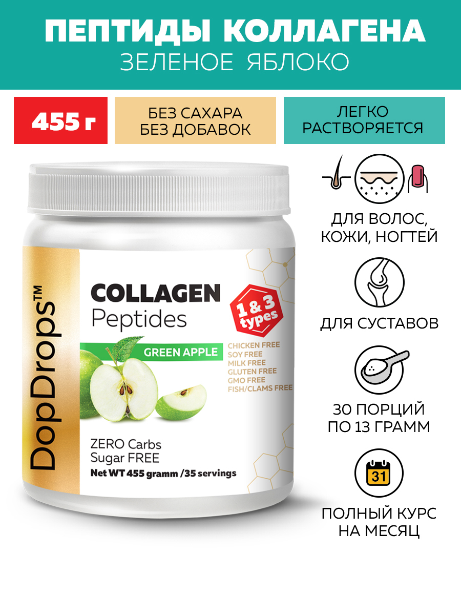 Новый и улучшенный! Порошок ДопДропс Коллаген ( DopDrops 100% Collagen Peptides ) - питьевой говяжий гидролизованный первого и третьего типа со вкусом Зеленого яблока без красителей в наиболее биологически доступной форме пептидов (в порошке). Ежедневное