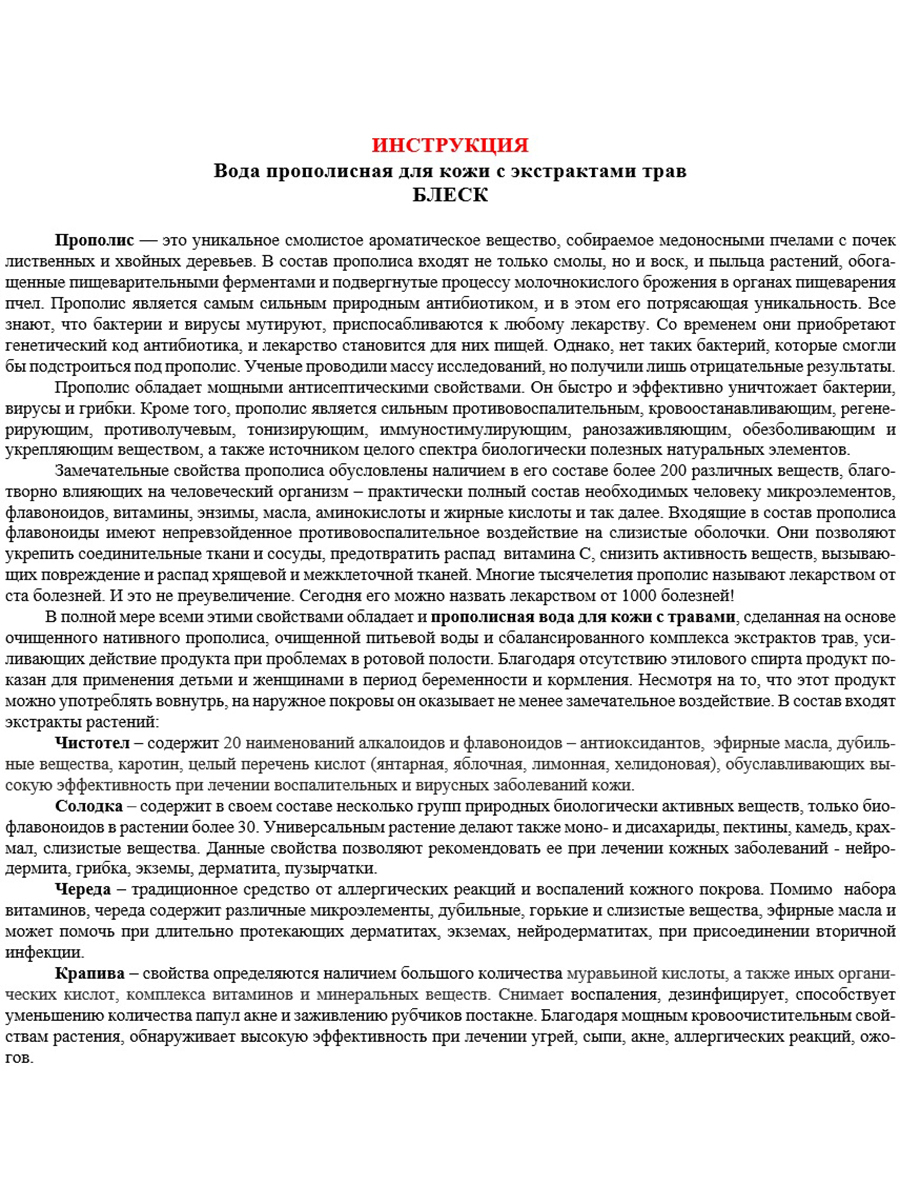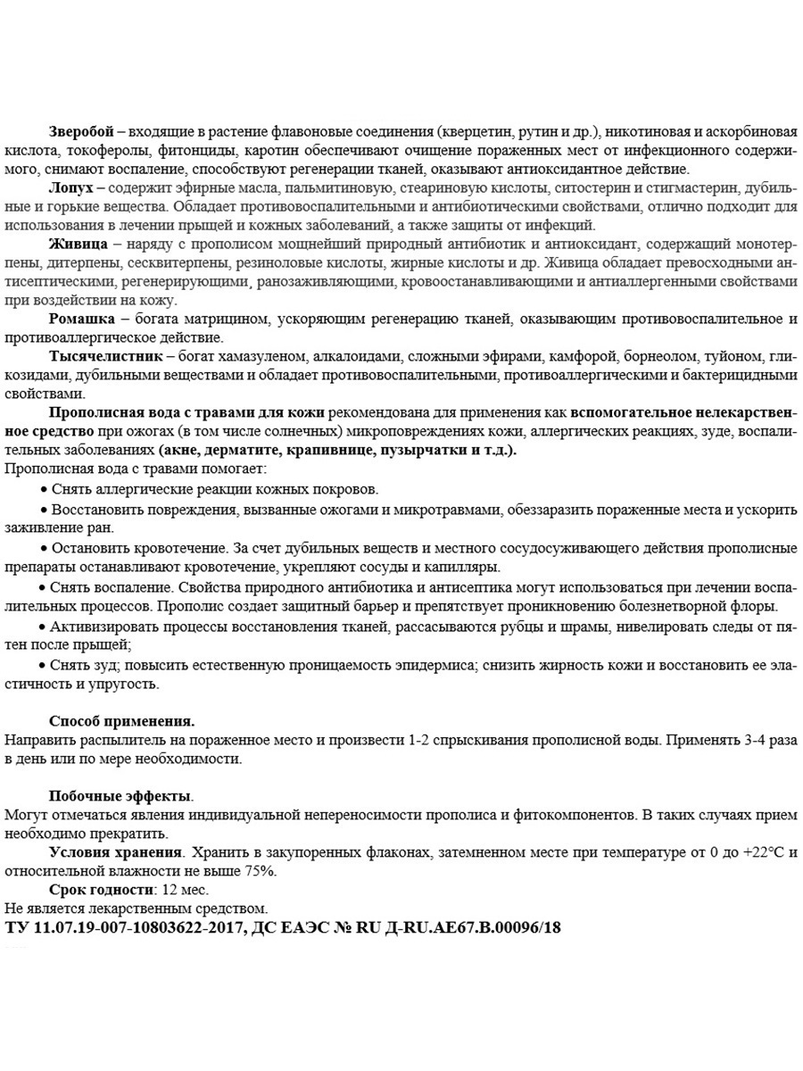 Способ примененияНаправить распылитель на пораженное место и произвести 1-2 спрыскивания прополисной воды. Применять 3-4 раза в день или по мере необходимости.