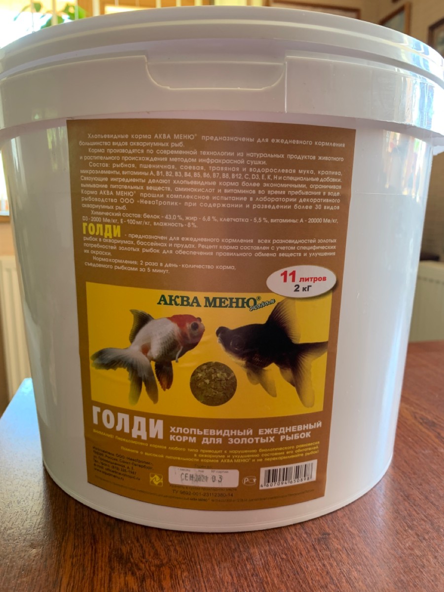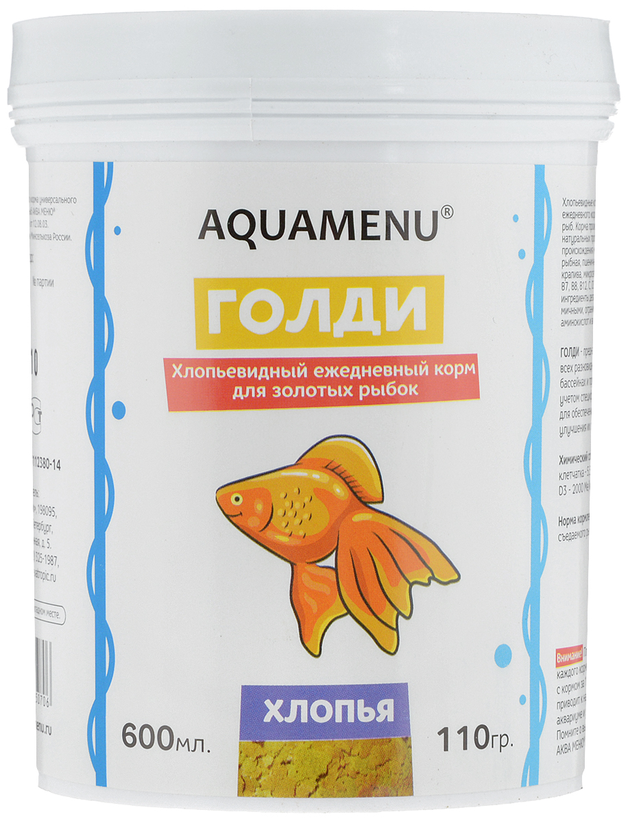 Состав:рыбная, пшеничная, соевая, травяная и водорослевая мука, крапива, микроэлементы, витамины A, B1, B2, B3, B4, B5, B6, B7, B8, B12, C, D3, E, K, H и специальные добавки.Описание:Хлопьевидный корм Aquamenu "Голди" предназначен для ежедневного кормлени