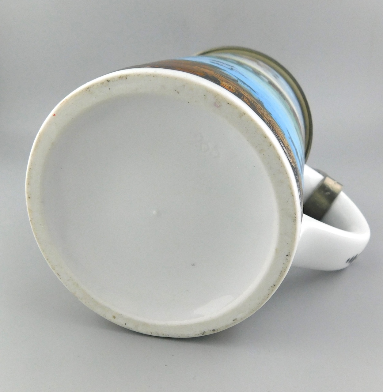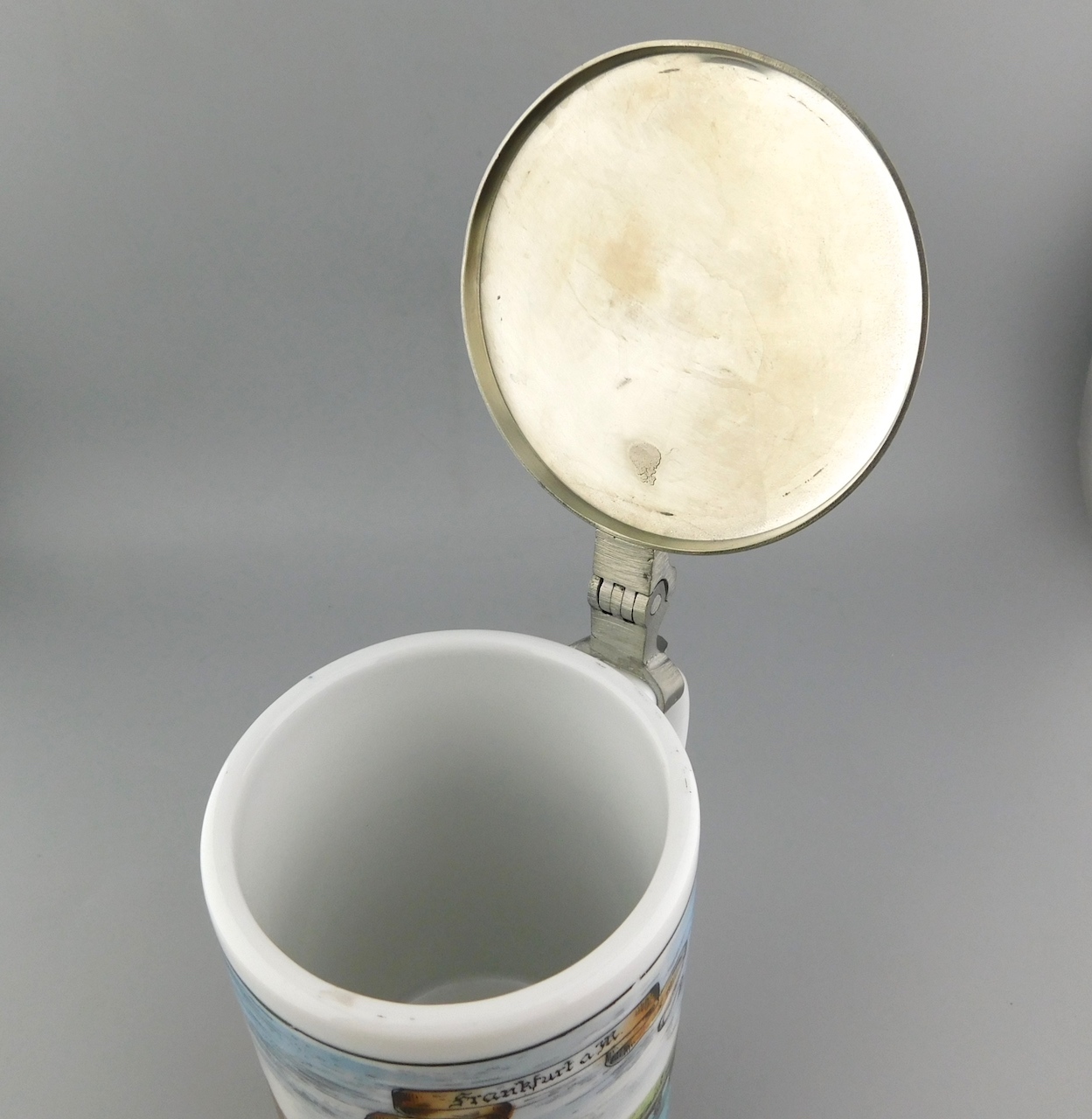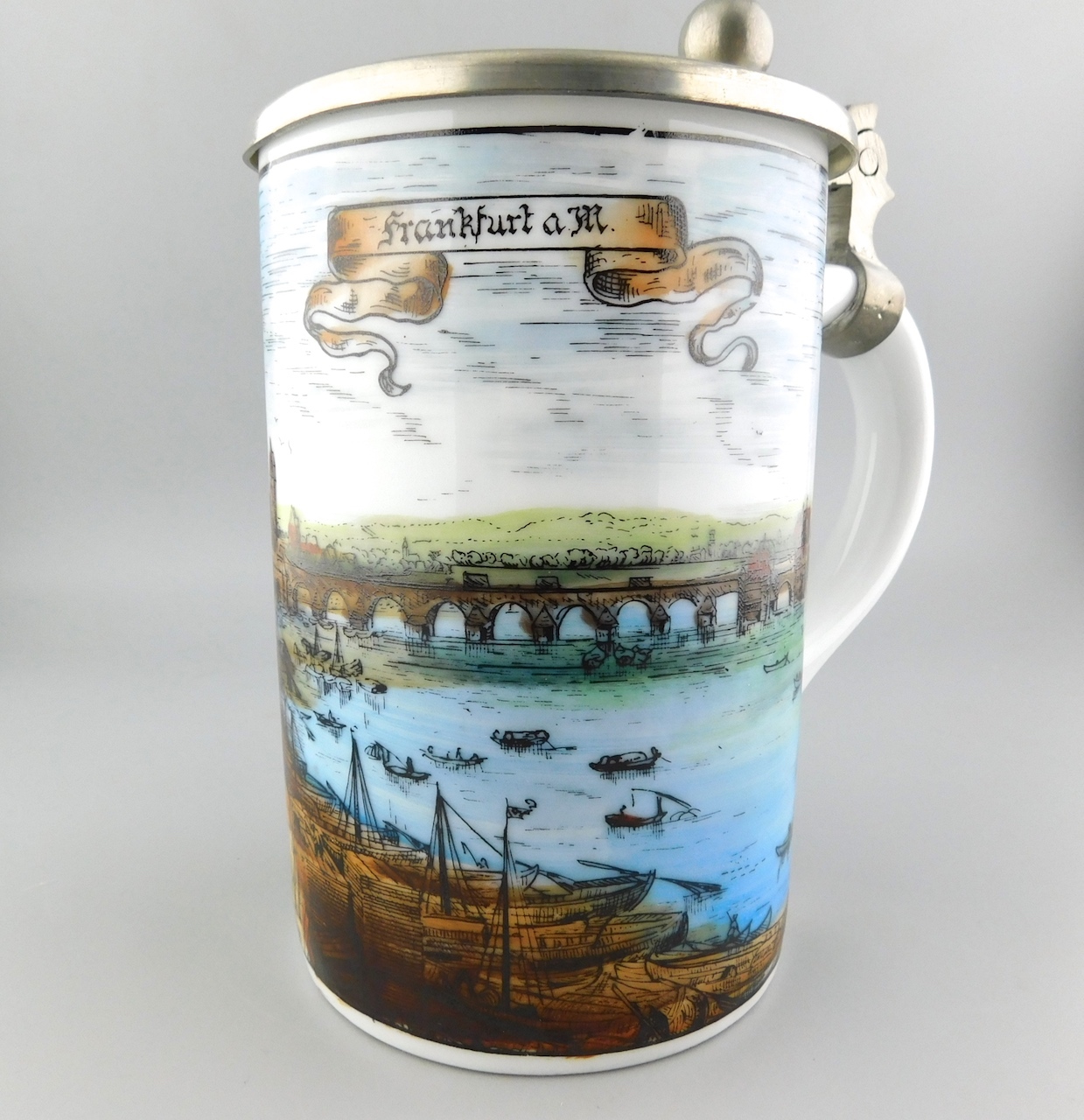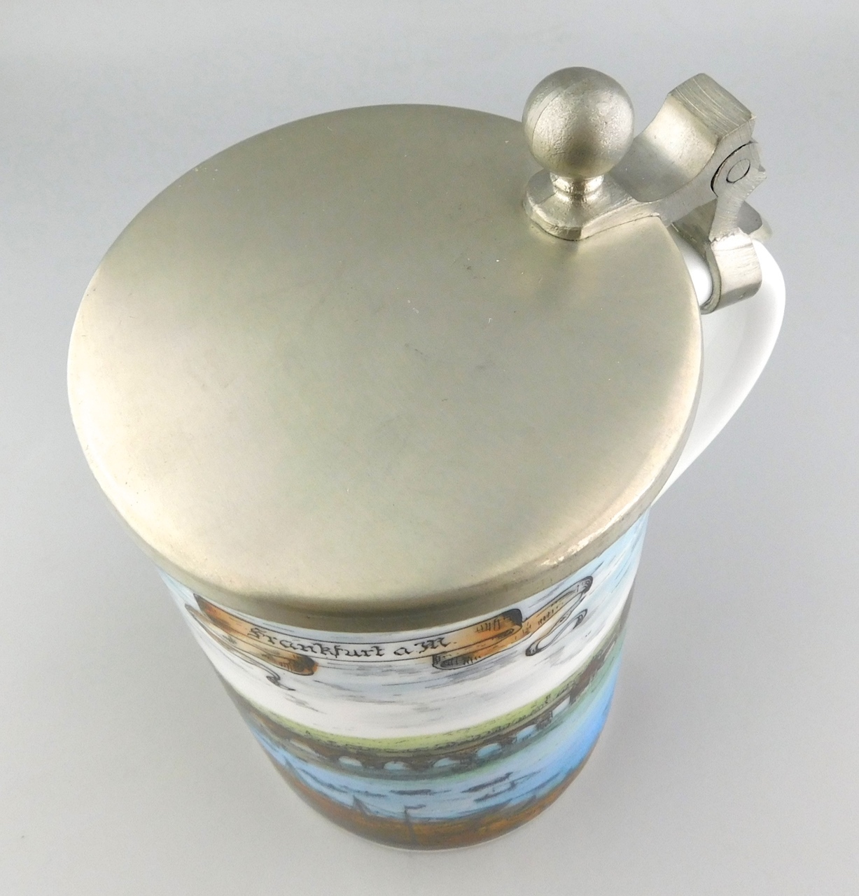 Пивная кружка из фарфора. Крышка из олова, закреплена на ручке.На картинке Франкфурт-на-Майне. Трафаретная печать и ручная роспись.Высота 16,5 см, объем 0,6 л.