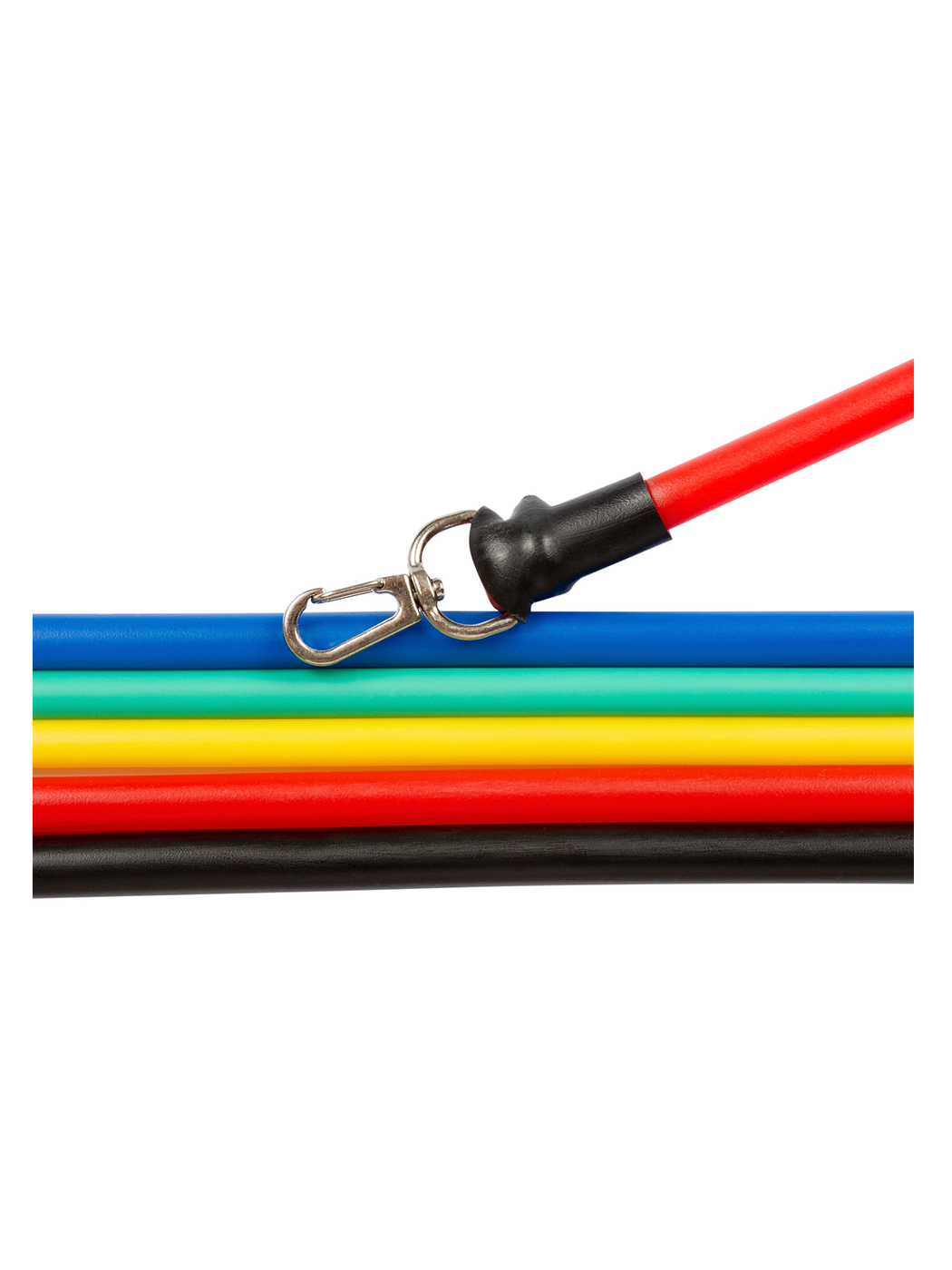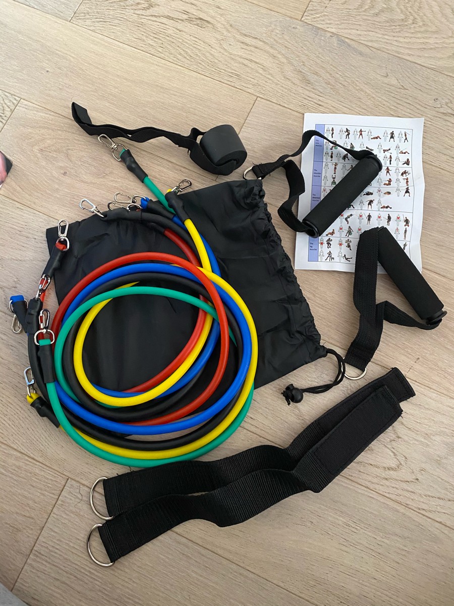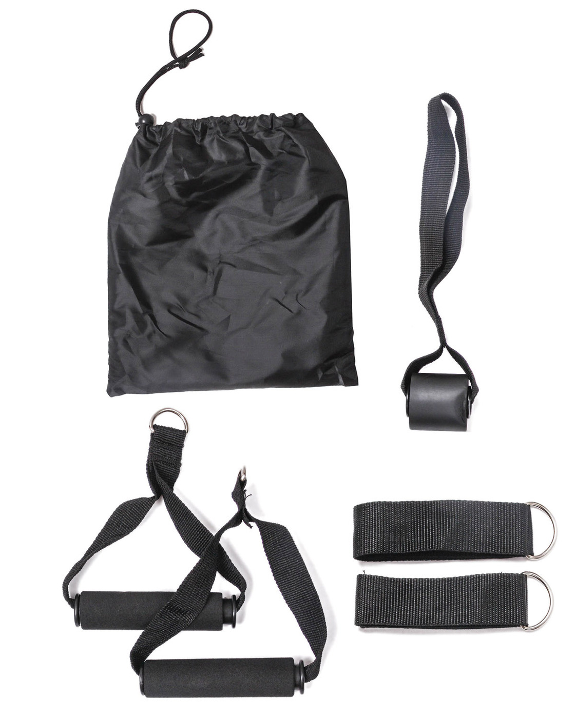 Комплектация:5 эспандеров различного натяжения:• черный - до 16 кг• зеленый - до 11 кг• синий - до 9 кг• красный - до 7 кг• желтый - до 5 кг2 ручки с пенопластом2 ремешка для крепления на лодыжке1 анкер1 сумка для переноскиВ наборе имеется все необходимое