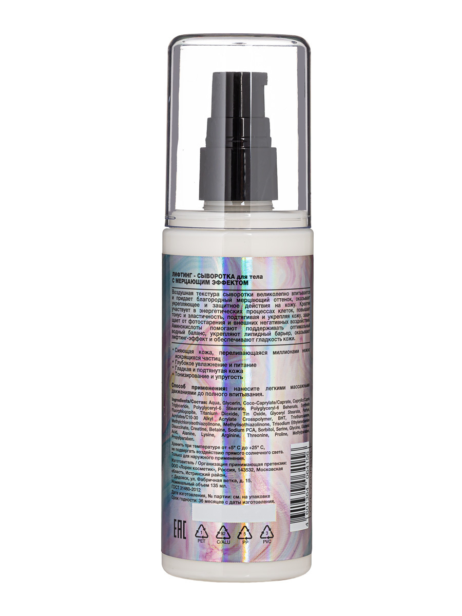 Состав средства:Aqua, Glycerin, Coco-Caprylate/Caprate, Caprylic/Capric Triglyceride, Polyglyceryl-6 Stearate, Polyglyceryl-6 Behenate, Synthetic Fluorphlogopite, Titanium Dioxide, Tin Oxide, Glyceryl Stearate, Parfum, Acrylates/C10-30 Alkyl Acrylate Cros