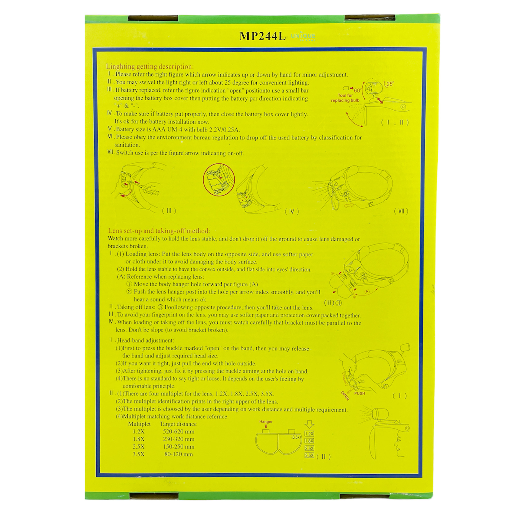 Лупа налобная с подсветкой MP244L с головным креплением.Размер лупы регулируется на голове (нажниме на кнопку и потяните до нужного размера).Имеет четыре линзы: (1.2Х) / (1.5Х) / (2.5Х) / (3.5Х) в защитном кейсе.Расстояние до объекта, мм: 520-620 / 230-32