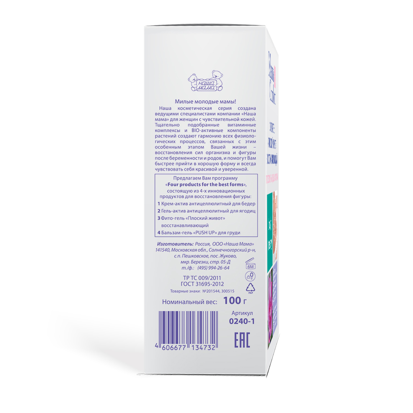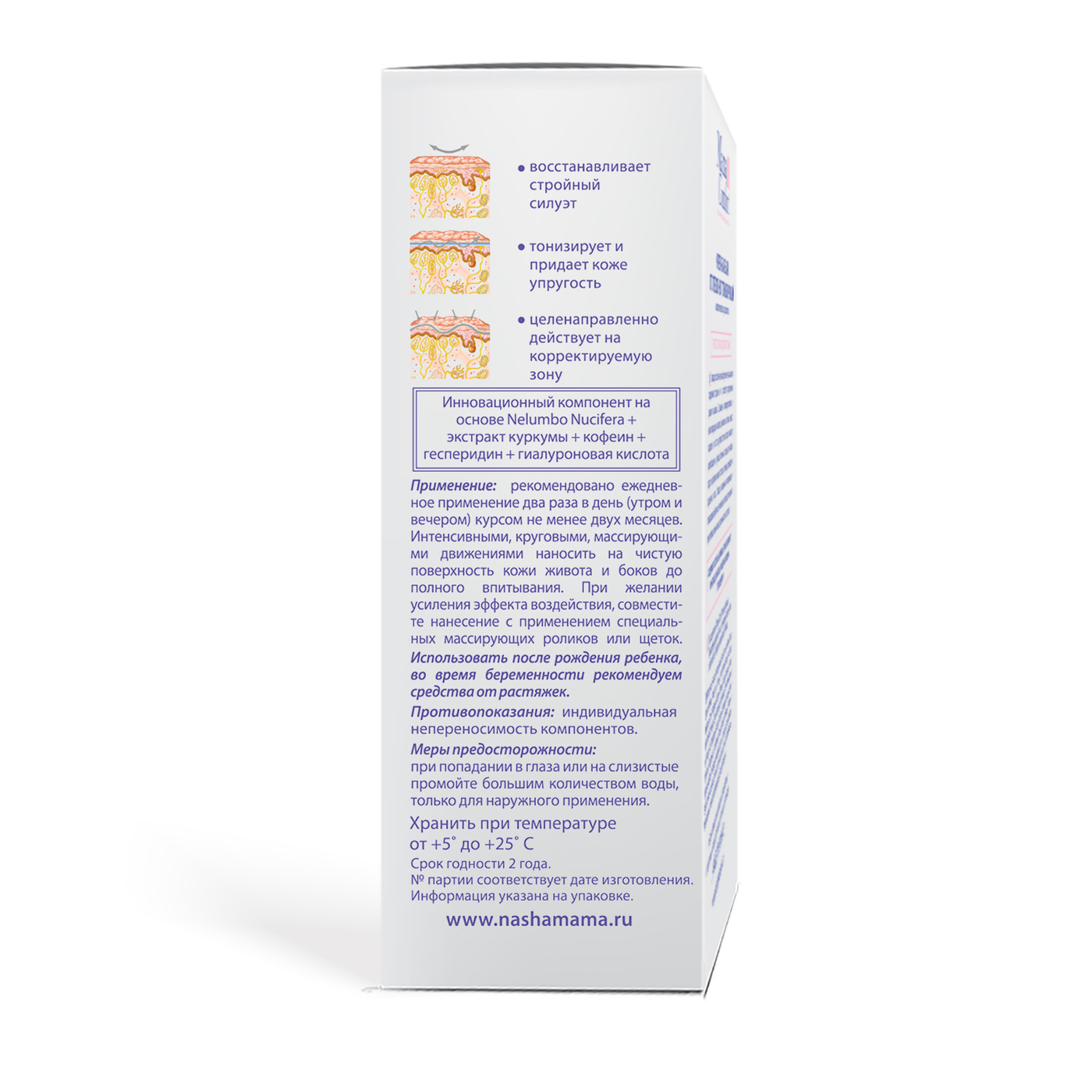 Способ примененияРекомендовано ежедневное применение два раза в день (утром и вечером) курсом не менее двух месяцев. Интенсивными, круговыми, массирующими движениями наносить на чистую кожу живота и боков до полного впитывания. При желании усиления эффекта воздействия, со