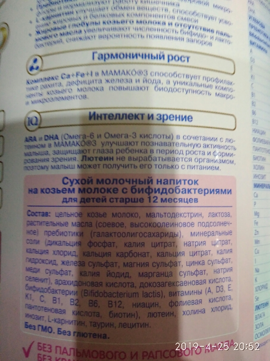 Состав:Цельное козье молоко, лактоза, мальтодекстрин, растительные масла (соевое масло, высокоолеиновое подсолнечное масло), пребиотики (галактоолигосахариды), минеральные соли (дикальция фосфат, калия цитрат, натрия цитрат, кальция хлорид, кальция карбон