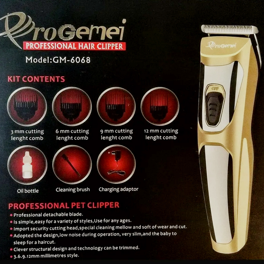 Комплектация:-Машинка для стрижки ProGemei GM-6068-Насадки сменные 4 шт. - 3 мм, 6 мм, 9 мм и 12 мм-Щеточка для чистки-Масло для смазки-Блок питания для зарядкиОписание:Машинка для стрижки волос, бороды и усов Pro Gemei GM-6068: беспроводной триммер в ком