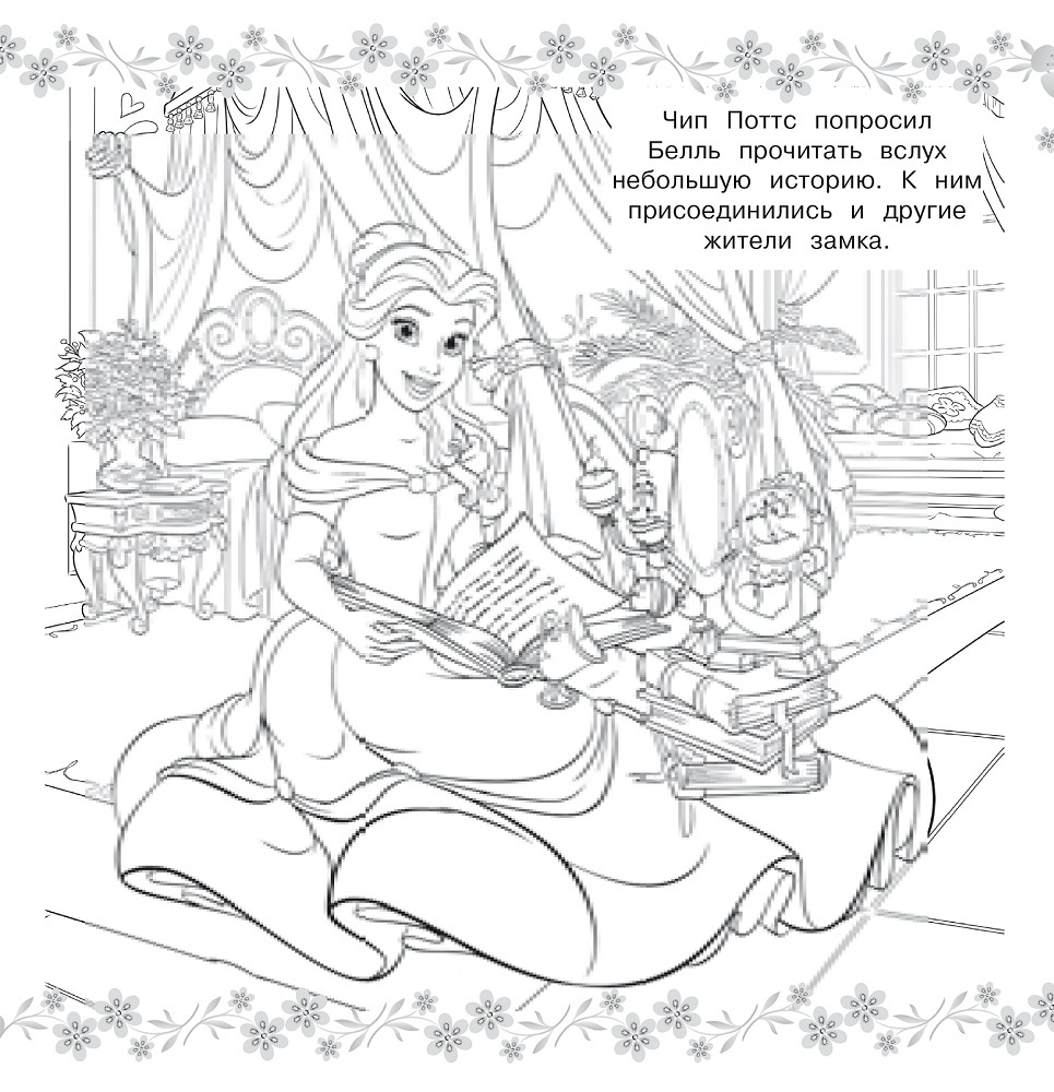 Раскраска с героями любимого мульфильма в формате большого блокнота. Фигурки персонажей (Золушка и Белль) для вырезания на обороте раскраски. Размер раскраски 23х24 см, 80 стр.