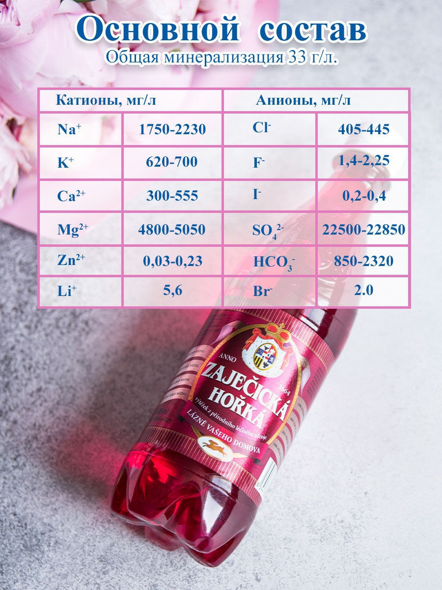 Условия хранения:Хранить при температуре от 5 до 25 градусов в условиях отсутствия прямого солнечного света;Состав:Зайечицкая горькая - вода минеральная питьевая природная, лечебная, негазированная, сульфатная натриево-магниевая с общим уровнем минерализа