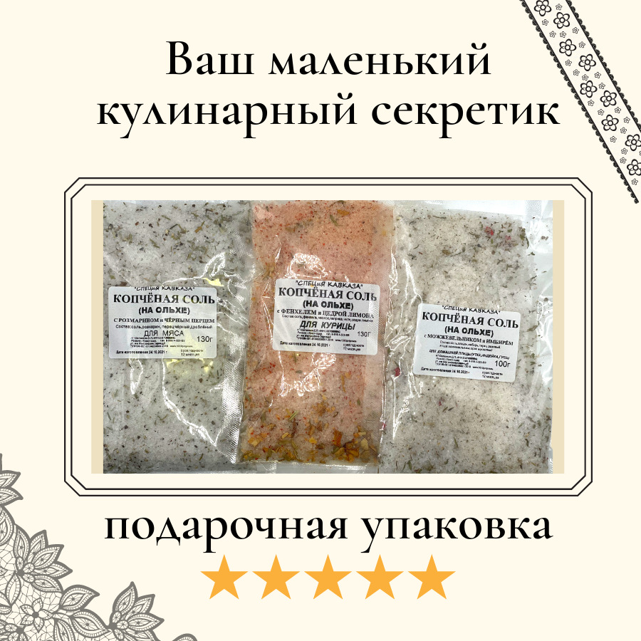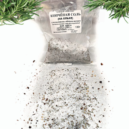 Состав:Смесь для мяса: соль копченая на ольхе, размарин, черный перец грубого помола. Смесь для курицы: соль копченая на ольхе, фенхель, чеснок, паприка, перец красный, корочки апельсина. Смесь для утки и кролика: соль копченая на ольхе, тимьян, тертый им