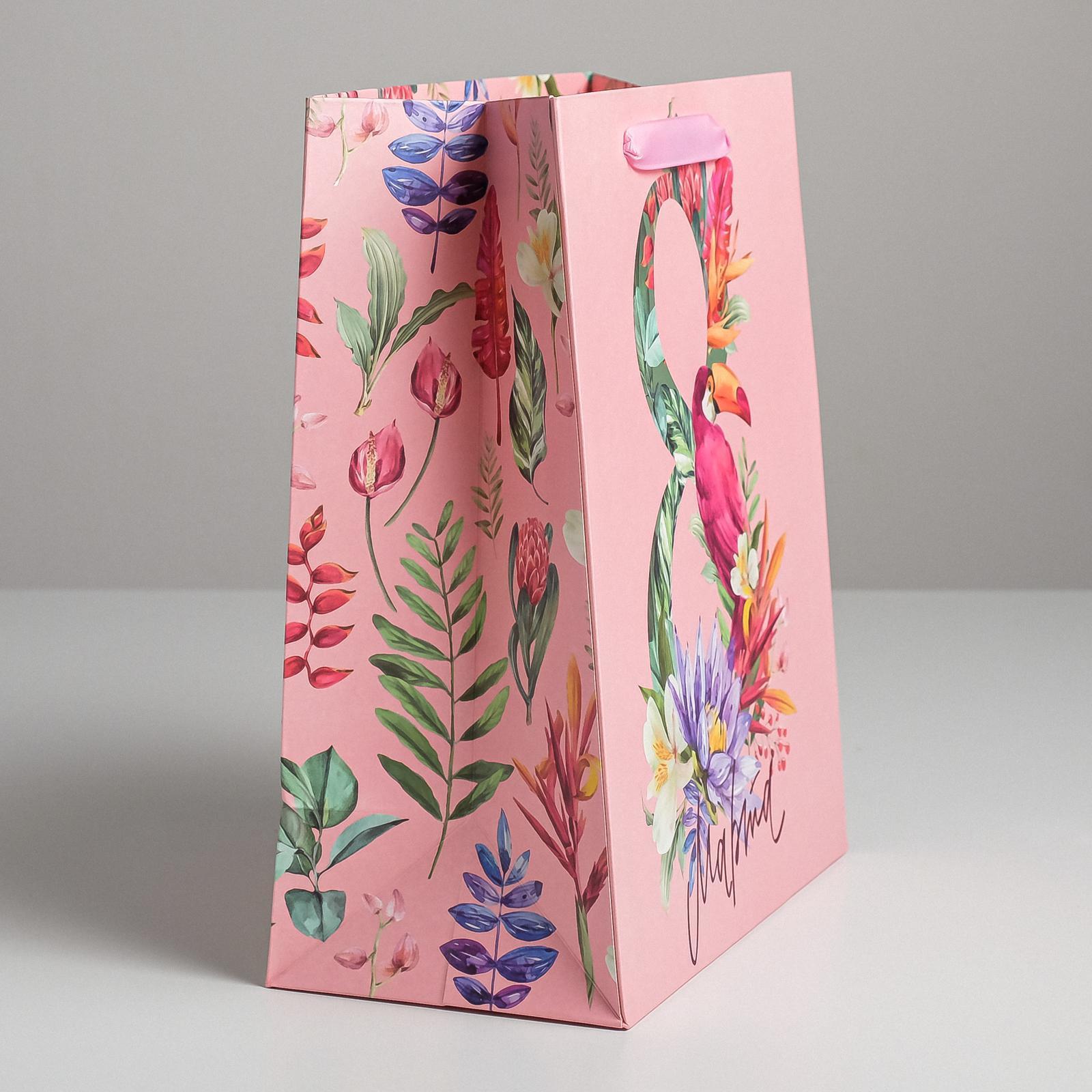 Набор из 6-ти пакетов, среднего размера 23х27х11,5 см. Ламинированные подарочные пакеты без надписи с принтом " 8 марта цветами ", с ручками из розовой ленты, высокой плотности бумаги 190г/м2. Отличная, подарочная упаковка, пакет для подарка любимой девуш