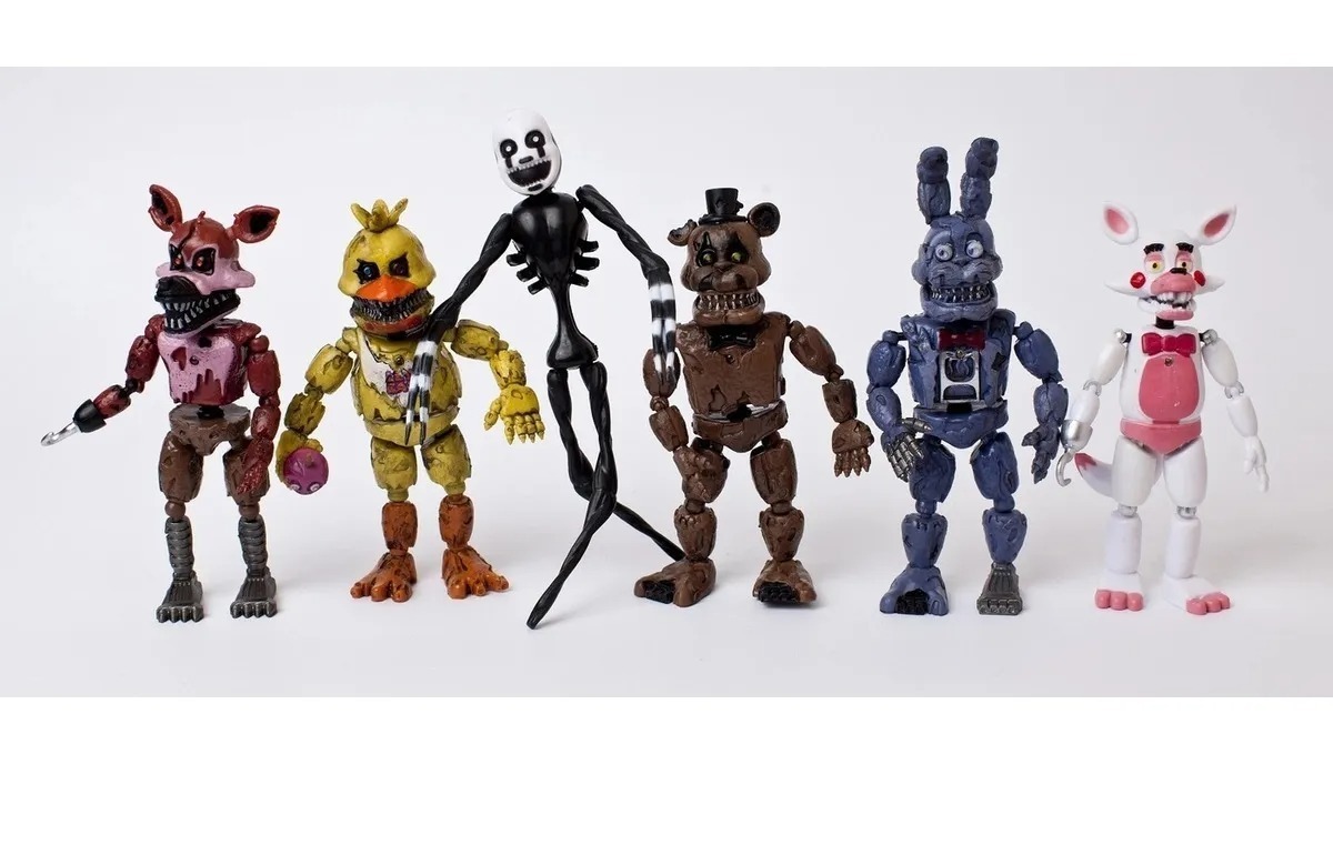 Разборные фигурки "Five Nights at Freddy's". У фигурок присутствует подсветка которая активируется нажатием кнопки на спине. Комплект 6шт.