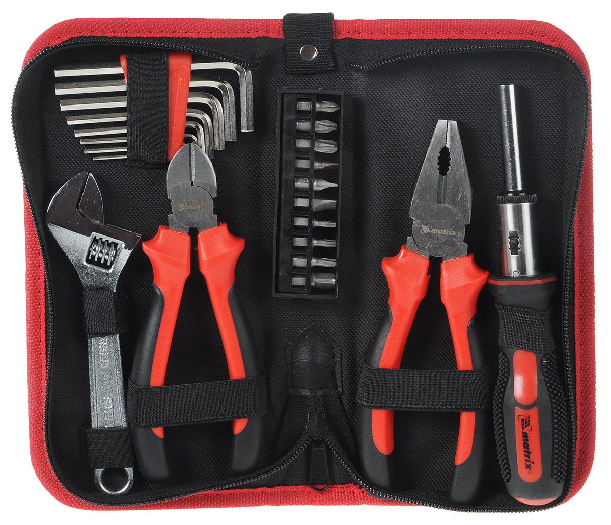 Набор инструментов Matrix - это необходимый предмет в каждом доме. Он включает в себя 22 предмета, которые можно уместить в нейлоновом чехле. Такой набор будет идеальным подарком мужчине. Состав набора: Бокорезы. Плоскогубцы. Отвертка реверсивная. Разводн