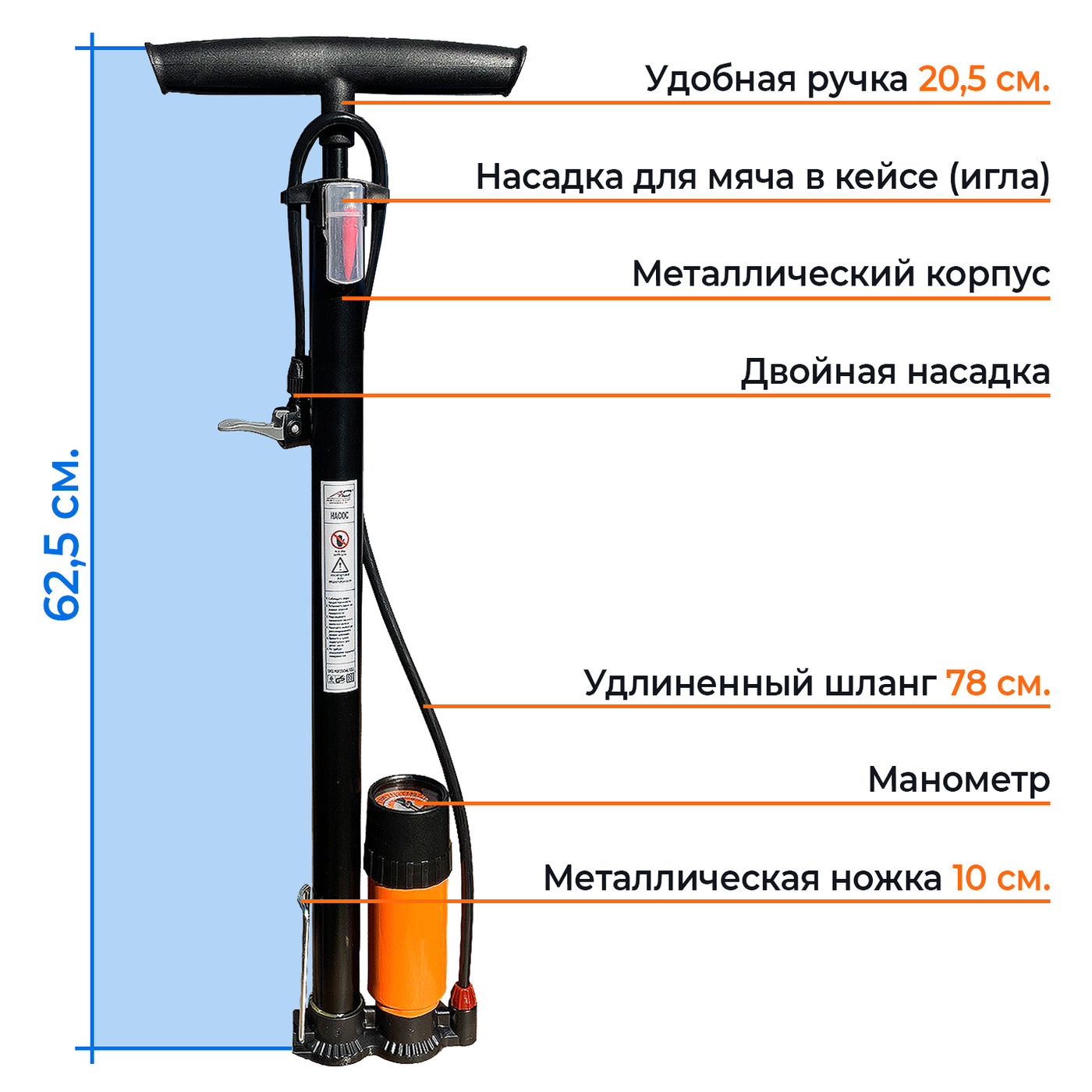 Насос ручной с манометром, удлиненный шланг, матовый (металл) HP6032B, + игла, +насадка для матраца, велосипедный/авто, 160 PSI, велонасос Автостор, черный/оранжевый