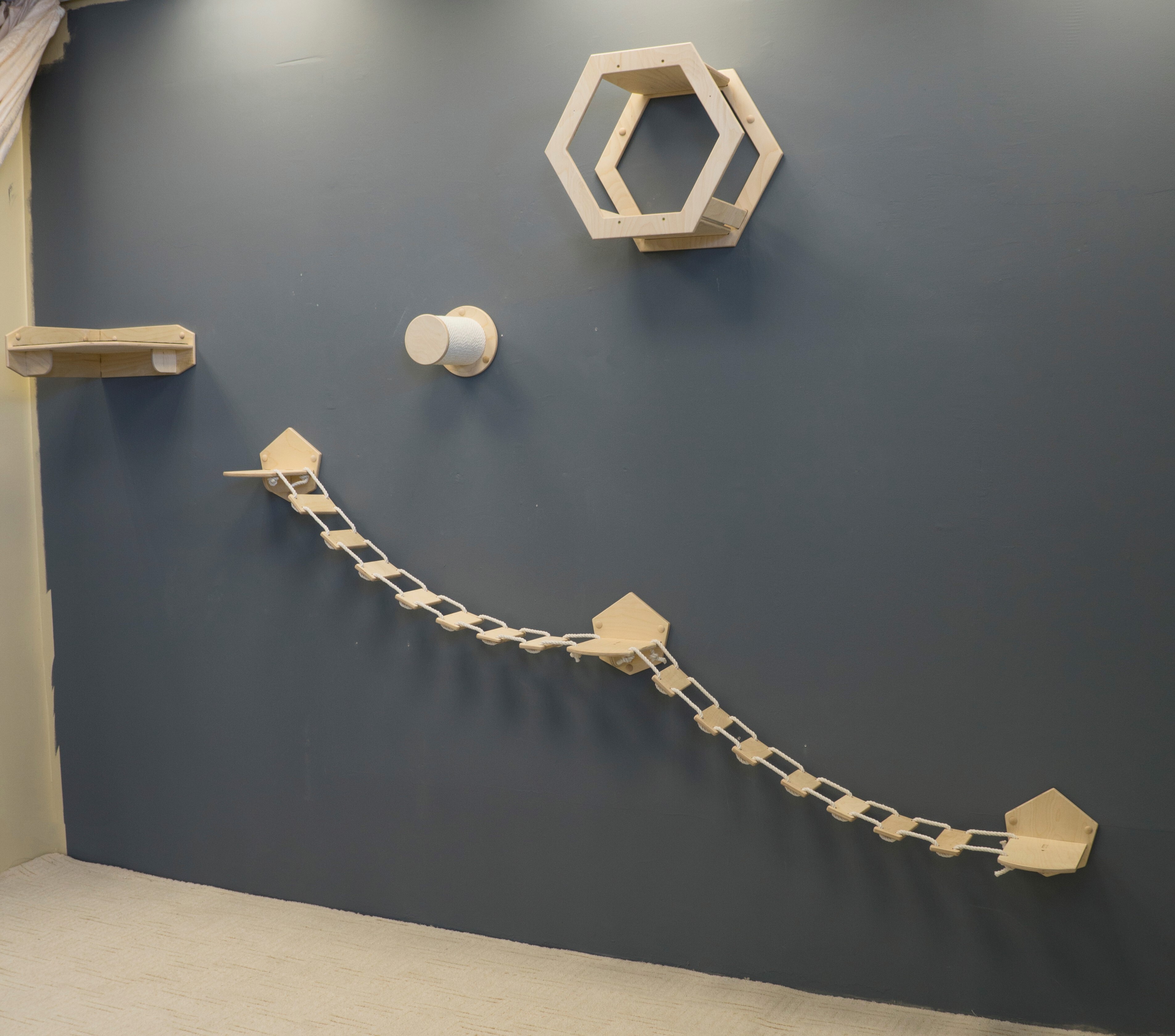 Как известно, кошки любят высоту. Они стараются забраться повыше, чтобы никто не мог до них добраться, и чтобы почувствовать себя в безопасности. Наш игровой настенный комплекс - это готовое решение для вашего питомца.В комплекс входят:6-ти угольный домик