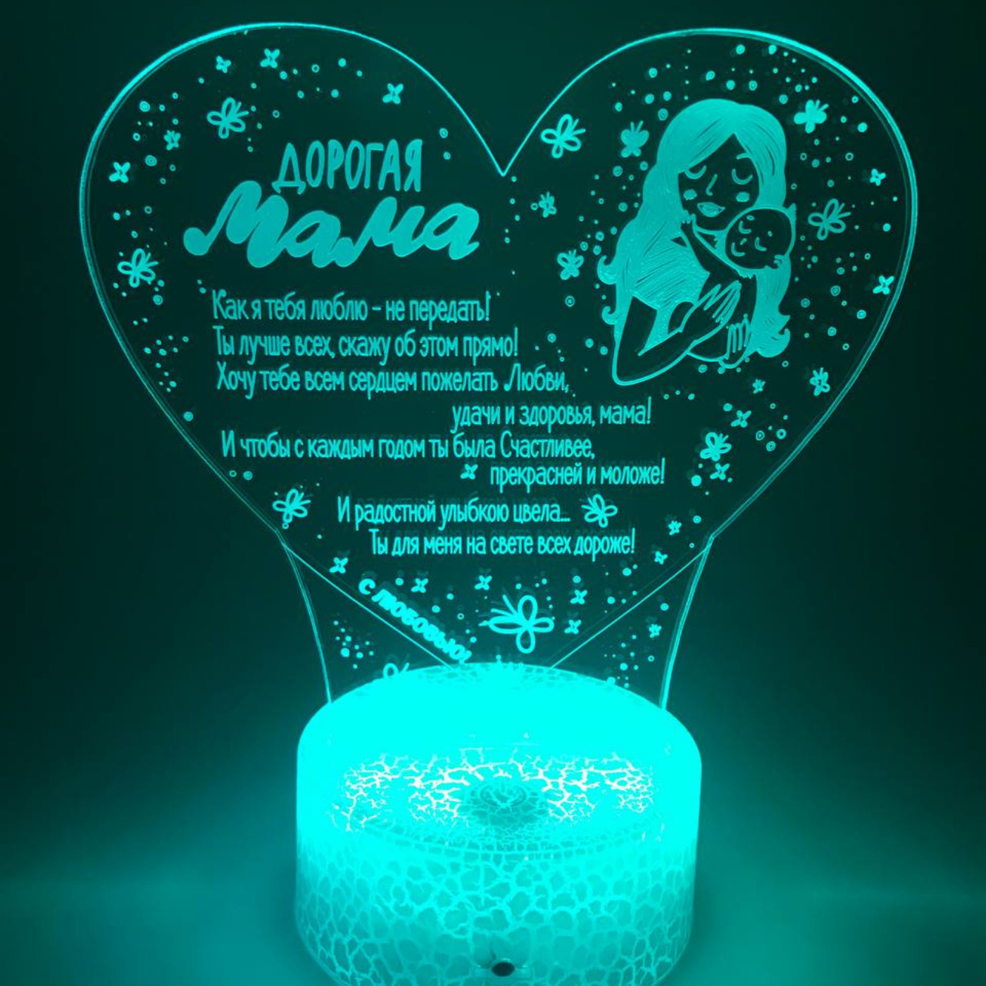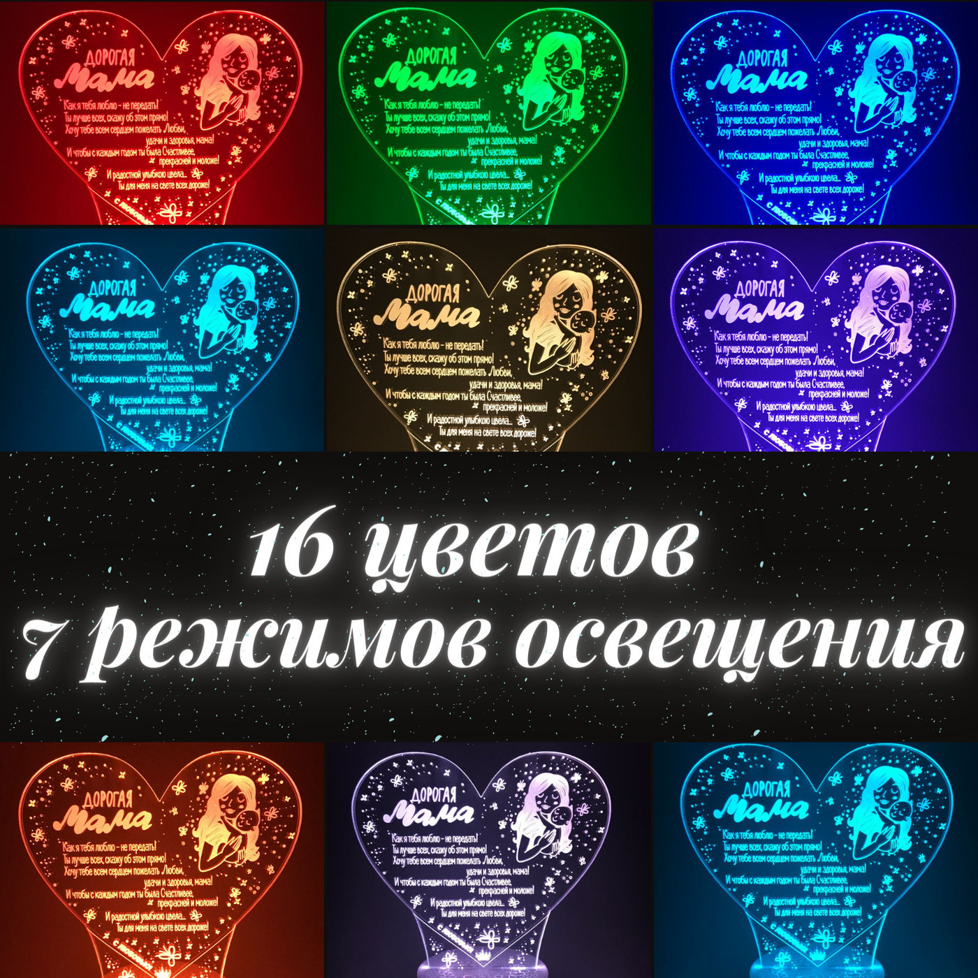 Комплектация:НочникПульт ДУПровод USBИнструкцияПодарочная упаковкаОписание:Перед применением снимите пленку с двух сторон (можно щипчиками).Креативный ночник - идеальный подарок для наших любимых мамочек.Он освещает 16 цветами, вы можете зафиксировать оди