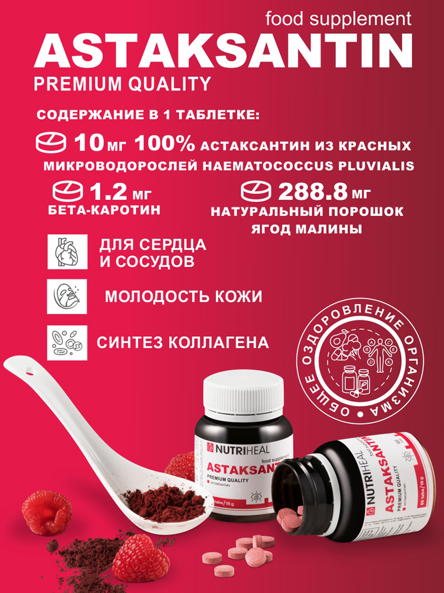 Состав:100% астаксантин из красных микроводорослей Haematococcus Pluvialis, бета-каротин, натуральный порошок ягод малины.Способ применения:По 1 таблетке 2 раза в день во время еды.Описание:Монопродукт, 100% органический, полученный из микроскопической кр