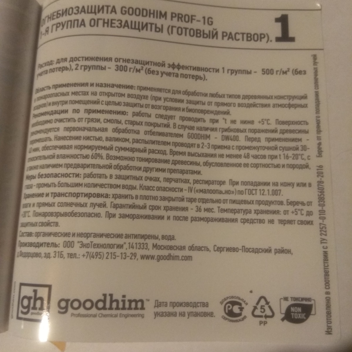 ОГНЕБИОЗАЩИТА GOODHIM PROF 1 G - профессиональная огнезащита и биозащита древесины с усиленным антисептическим и огнезащитным действием I группы (высшая) согласно ГОСТ Р 53292-2009. Применяется для обработки любых типов деревянных конструкций в пожароопас