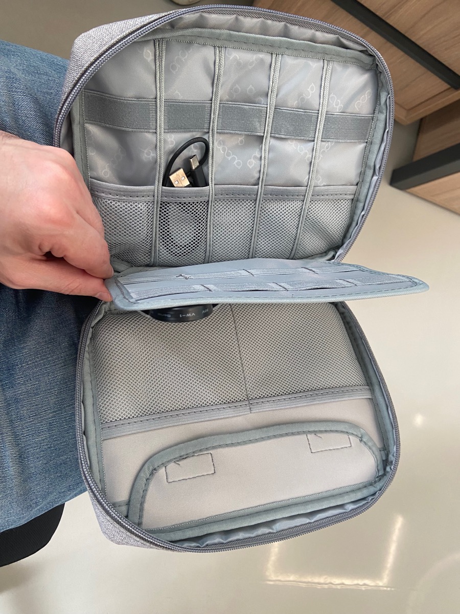 Органайзер предназначен для хранения проводов, наушников, powerbank, телефона, планшета, флэшки, можно хранить внешний аккумулятор, жесткий съемный диск, зарядные устройства, а также другие мелочи.Органайзер изготовлен из качественного водонепроницаемого
