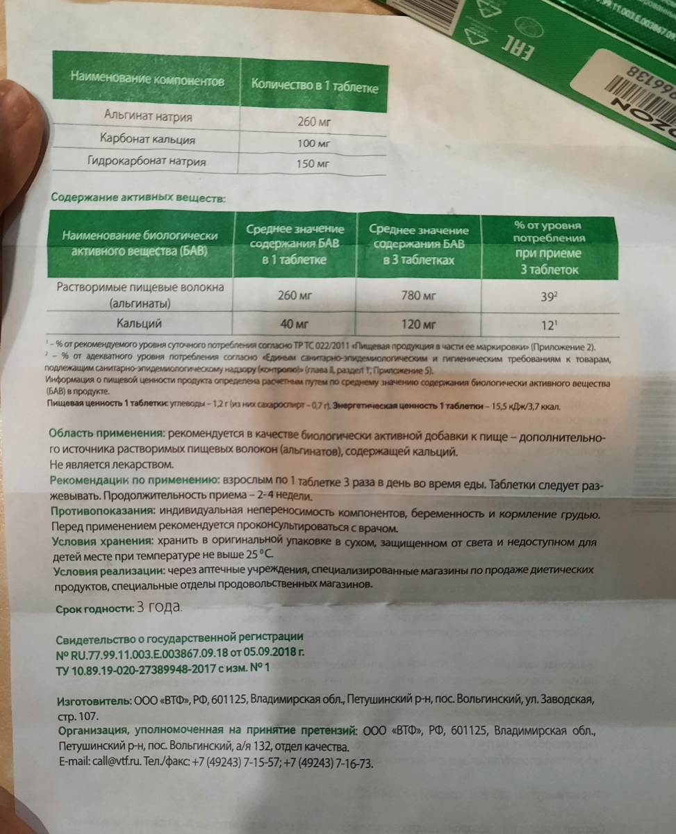 МНН/Действующее вещество:Растворимые пищевые волокна (альгинаты), кальций Дозировка:В 1 жевательной таблетке:Растворимые пищевые волокна (альгинаты) – 260 мгКальций – 40 мгСостав:Подсластитель: сорбит; декстроза; альгинат натрия; регулятор кислотности: на