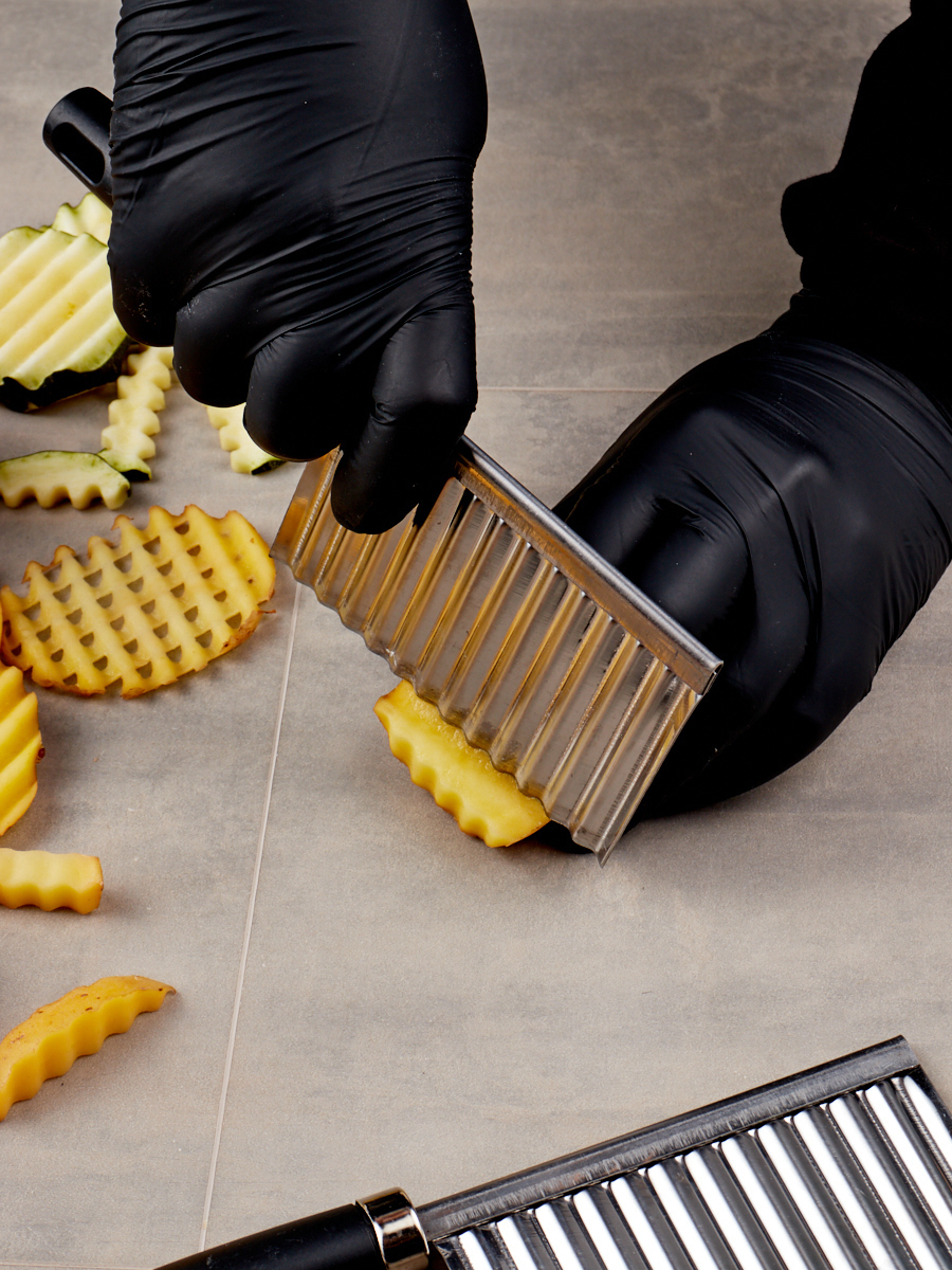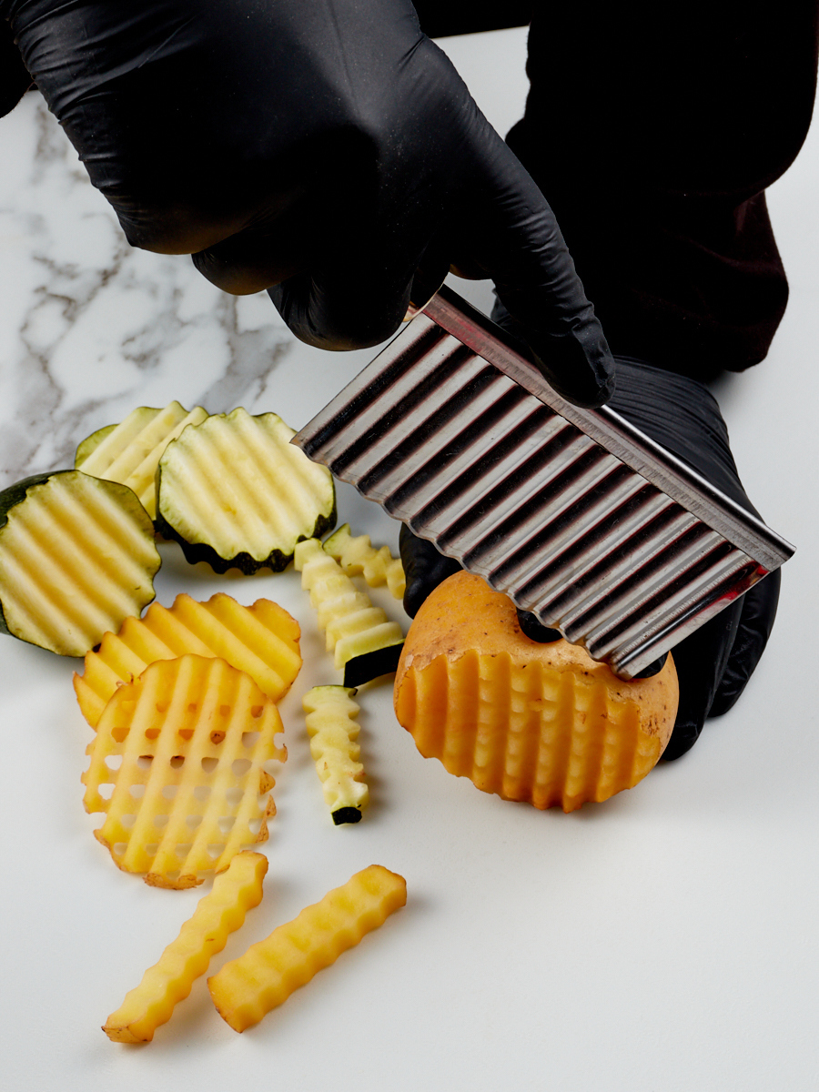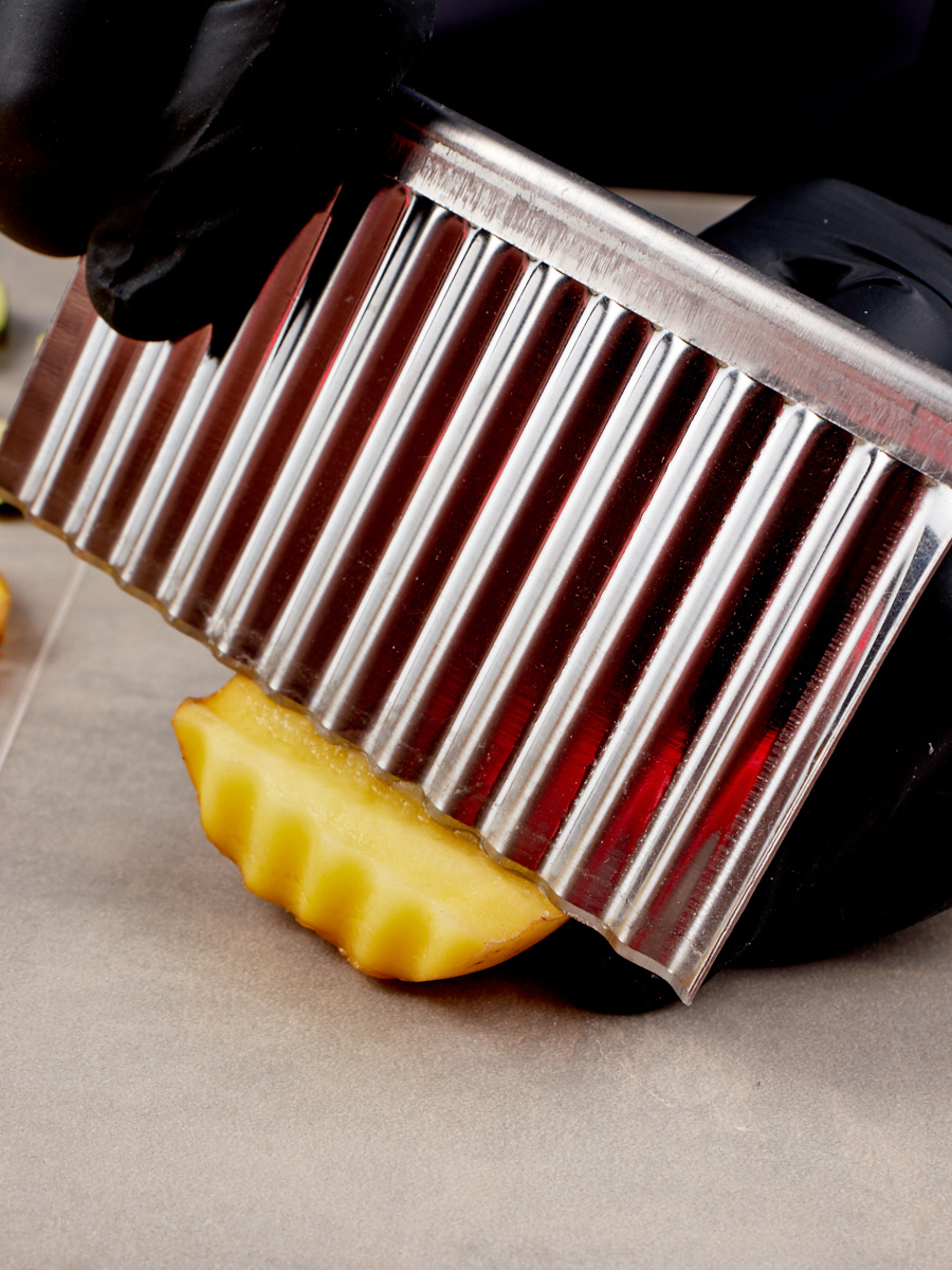 Комплектация:Нож для фигурной нарезки - 1 штОписание:Нож для волнистой нарезки предназначен для фигурной нарезки фруктов, овощей и любых других продуктов, размером 19*6,5 см., имеет характерное лезвие с выпуклыми зубцами по всему прямому полотну. При наре