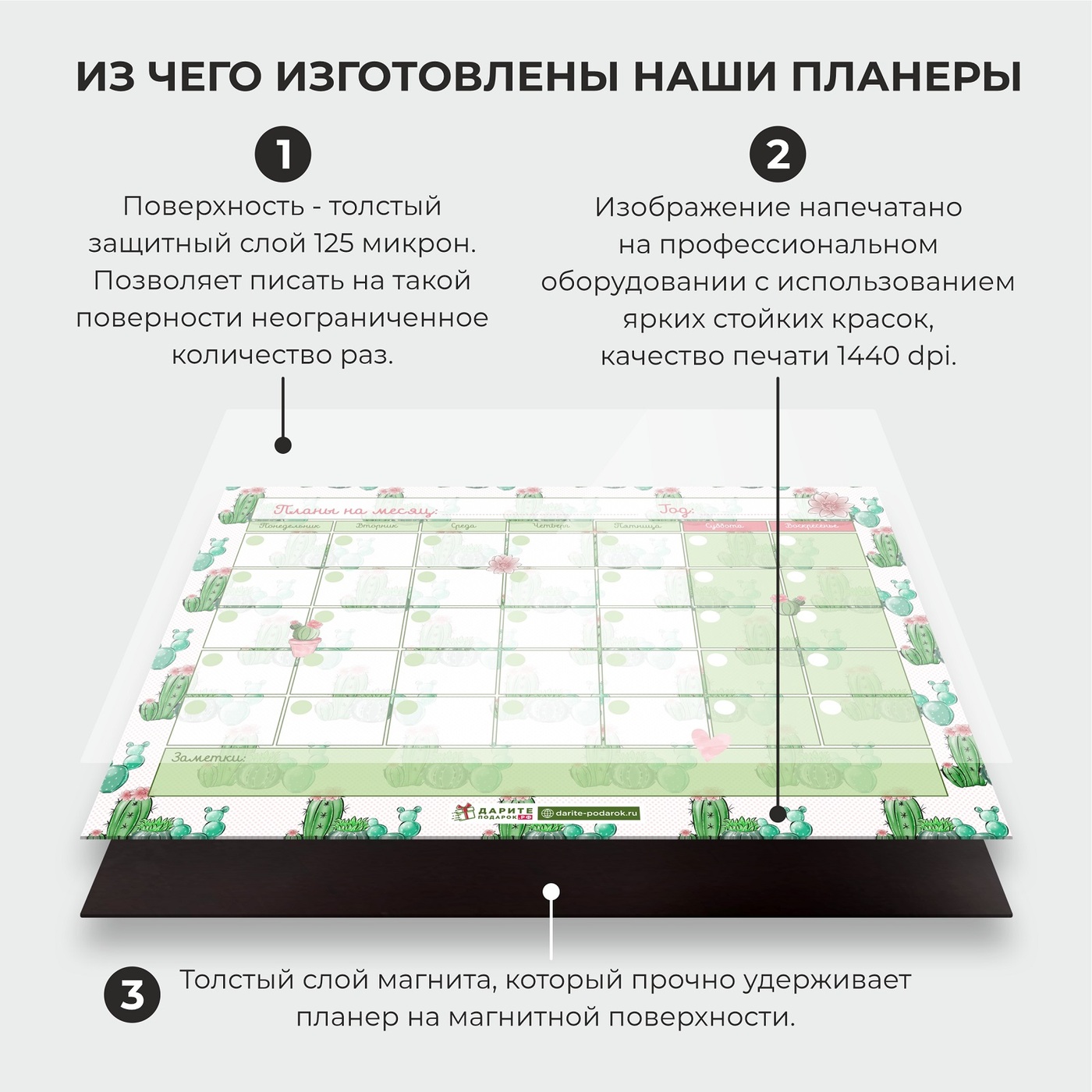 Гибкий магнитно-маркерный планер (планинг), прочно крепится на холодильник, магнитную доску, металлическую поверхность, также можно закрепить в любом месте, используя двусторонний скотч. Поверхность многоразовая пиши-стирай-пиши. В отличие от планеров дру