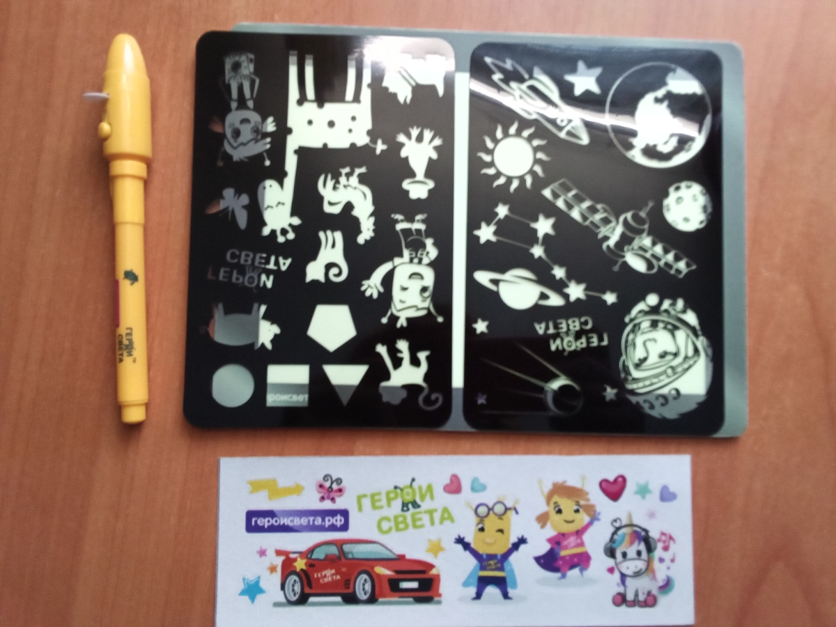Комплектация:1. Экран для рисования в виде электронного планшета.2. Фонарик для рисования светом.3. Трафарет.