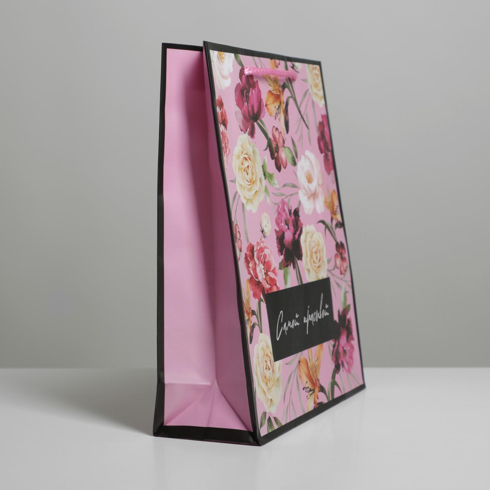 Комплектация:1шт. Пакет 23х27х8смОписание:Средний размер 23х27х8 см. Ламинированный подарочный пакет с надписью " Самой красивой " и принтом " Розовые зветы ", с ручками из розового шнура, плотность бумаги 157г/м2. Отличная, подарочная упаковка, пакет для
