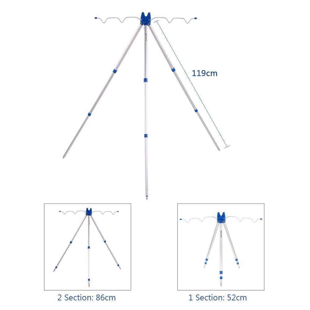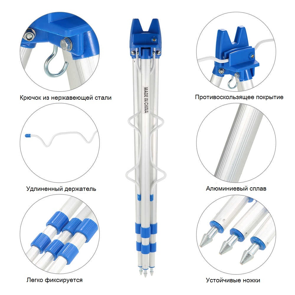 Комплектация:Тренога для удочек - 1 штОписание:Стойка-тренога для удилищ, изготовлена из прочных материалов (алюминий, пластик). Стойка мобильна и удобна в использовании. Легкий вес, пластиковые фиксаторы на ножках, крючок для противовеса, универсальный ф