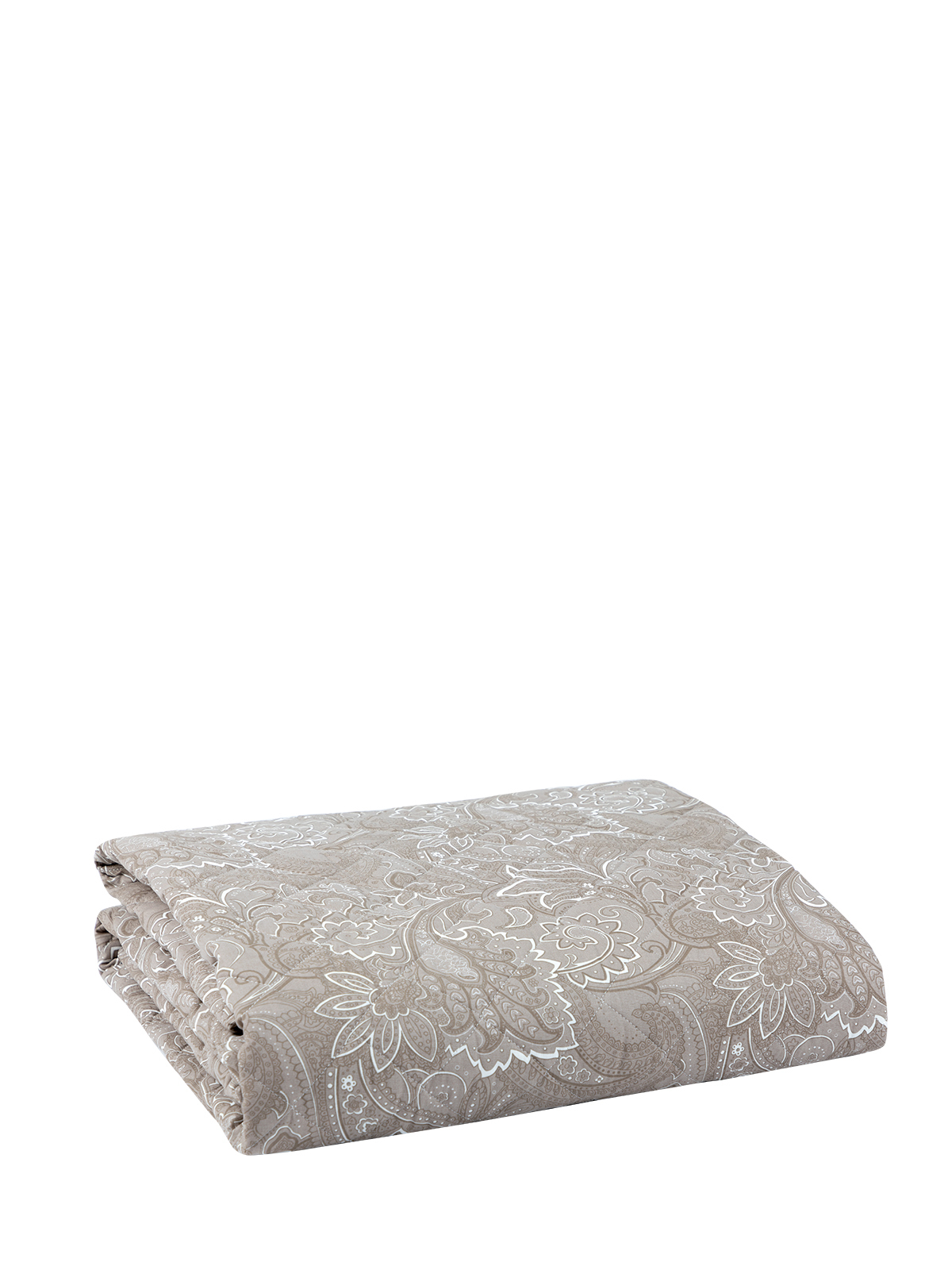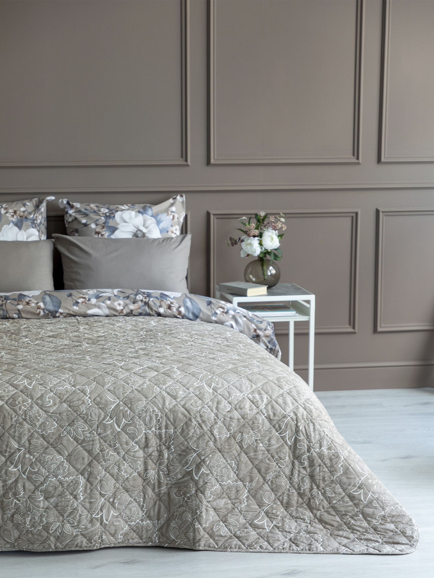 Покрывало Унисон Tesoro - быстрый и лёгкий способ освежить интерьер спальни. Спокойный оттенок бежевого и лаконичный флористический узор образуют прекрасный тандем. Кроме того, покрывало может служить дополнительным одеялом, если в комнате прохладно. Стёг