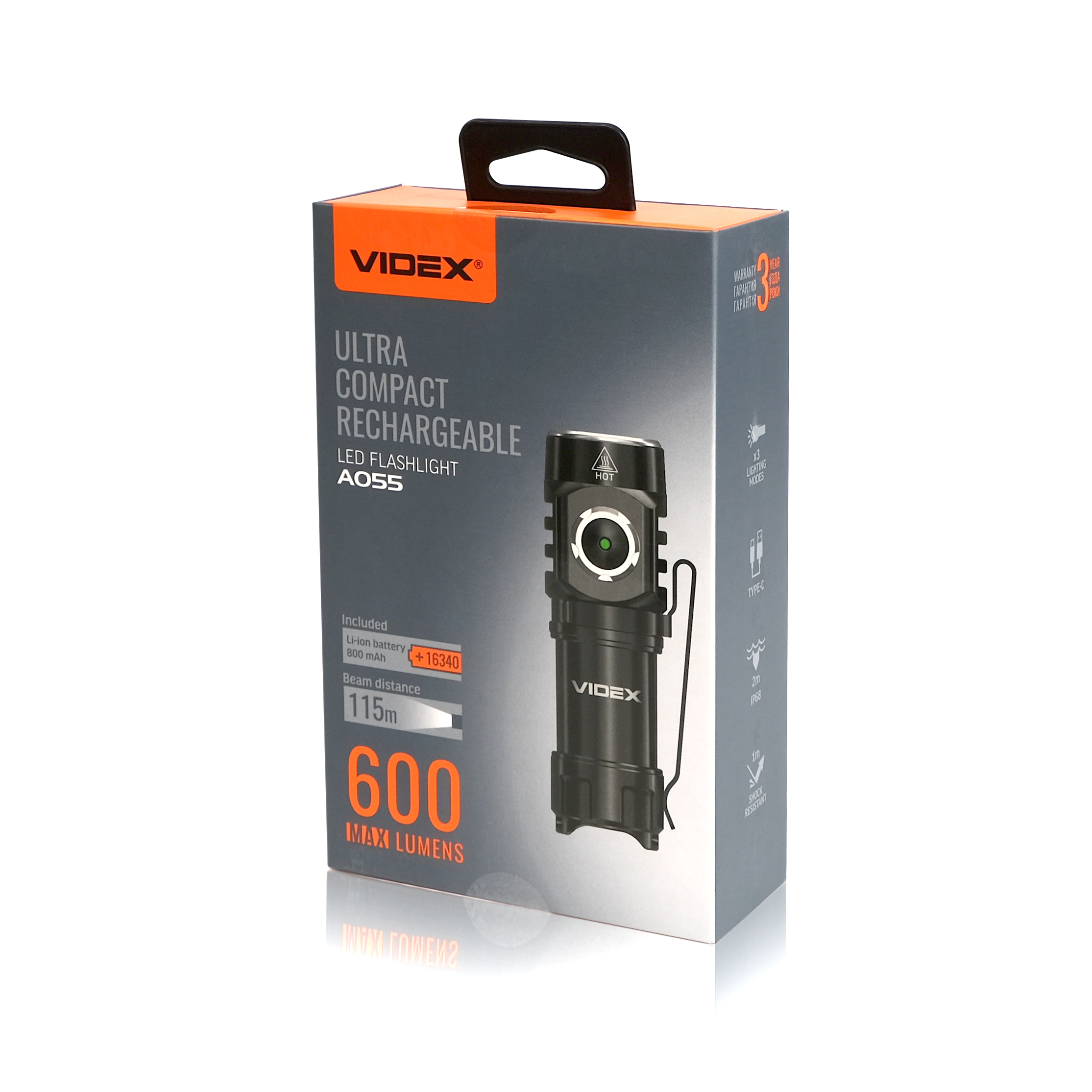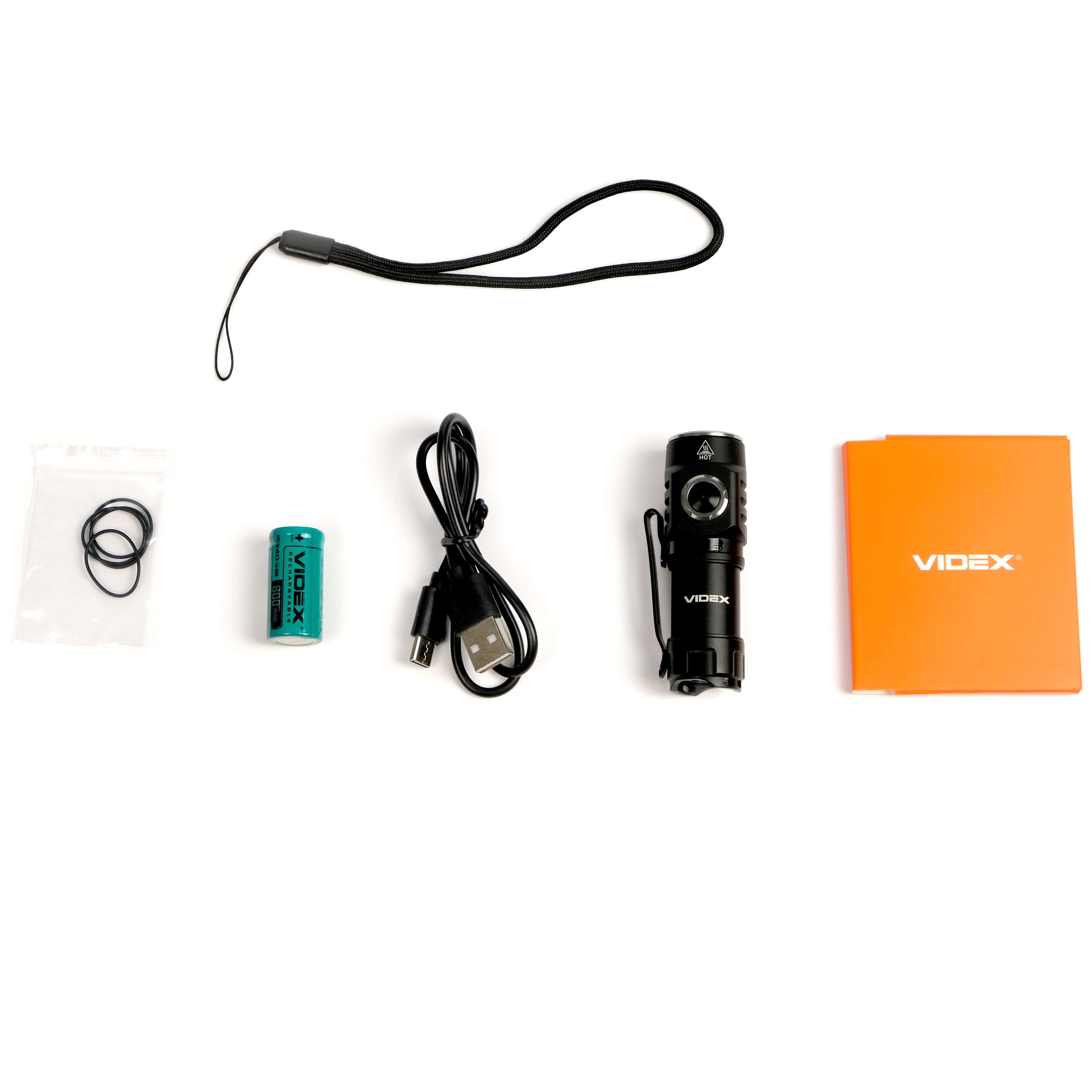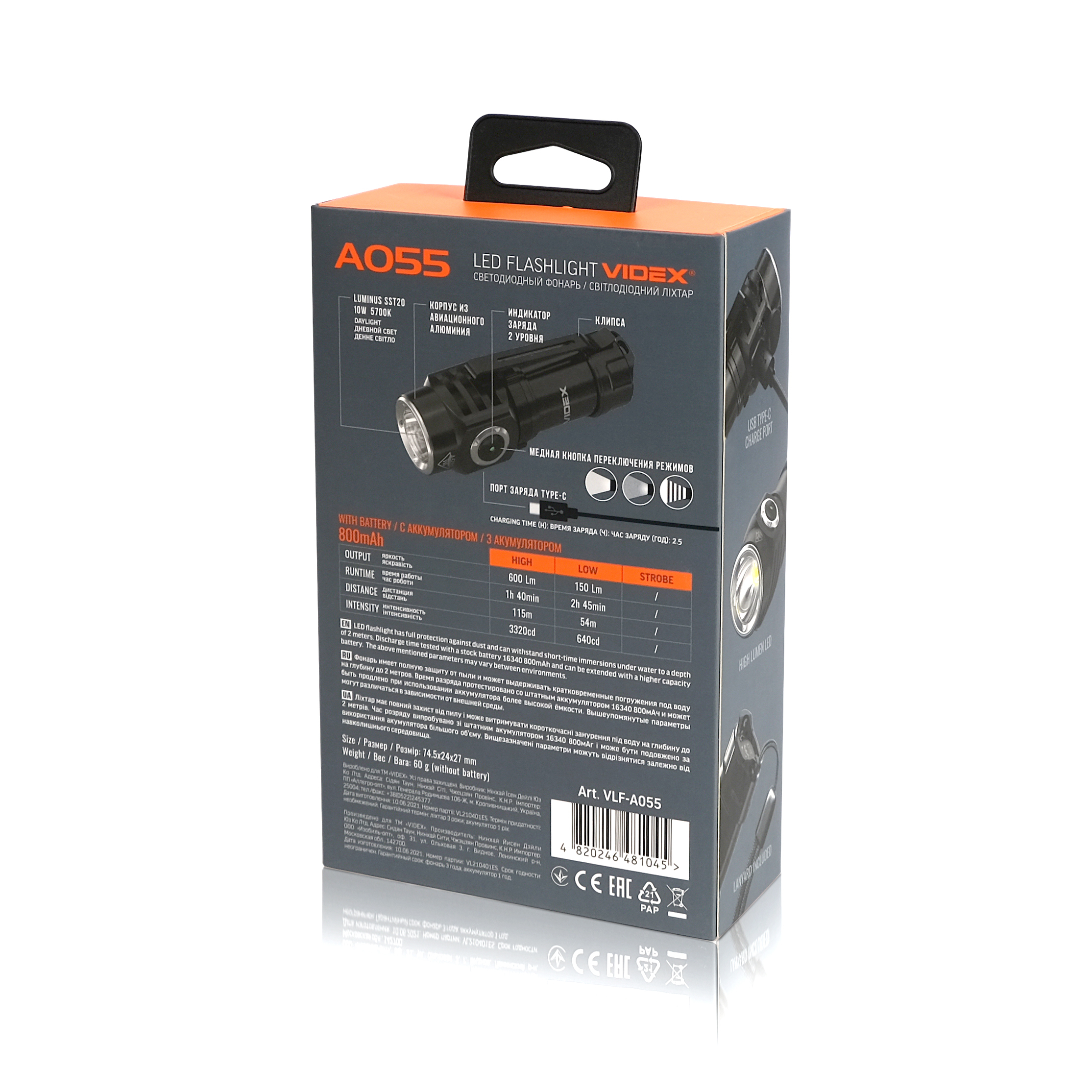 Комплектация:Инструкция; аккумулятор; Запасные уплотнители (резинки); Шнурок петля; USB кабель Type-A - Type-C; 1шт фонарикОписание:Портативный светодиодный фонарик VIDEX A055 600Lm 5700K максимальная яркость 600 Lm, светодиод Luminus SST20. Режим работы: