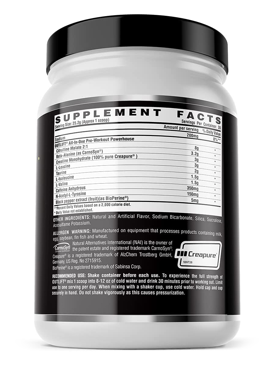СоставЦитруллин малат, бета аланин, креатин моногидрат, л-лейцин, таурин, л-изолейцин,л-валин,кофеин безводный,N-ацетил л-тирозин,экстракт чёрного перца.