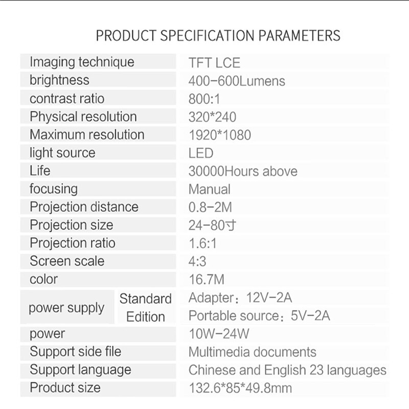 Модель: YG-320 Тип дисплея: LCD Собственное разрешение: 320x240 Разрешение поддержки: 1920x1080 Яркость: 400-600 люмен Контрастность: 800: 1 Коэффициент проецирования: 1,4: 1 Расстояние проецирования: 1,2-3 м Размер изображения: 20-80 дюймов Масштаб экран