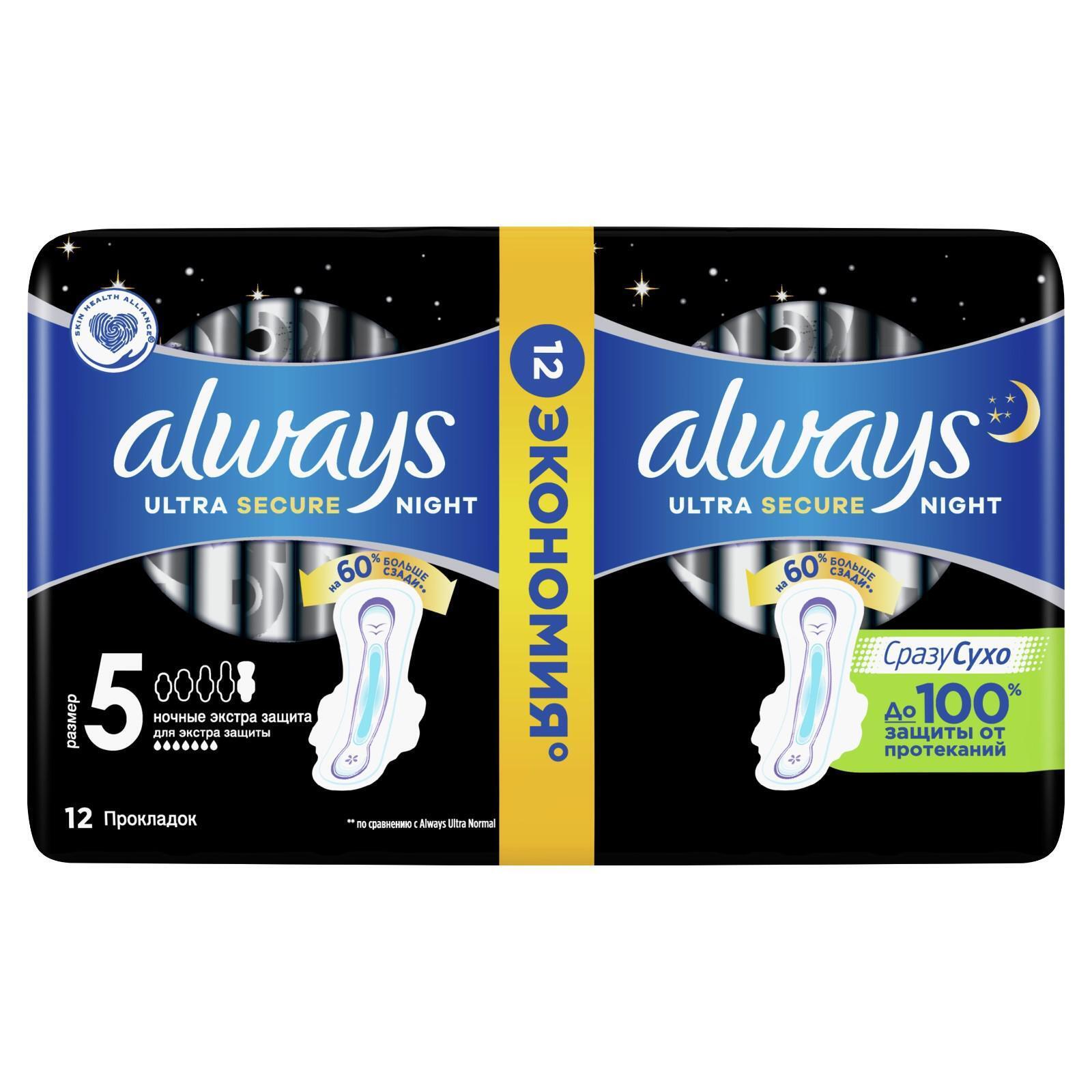 - Always Ultra Secure Night - женские гигиенические прокладки, предназначенные для использования в ночное время. Их высокий уровень защиты обеспечивает надежную защиту от протекания и неприятных запахов. Они обеспечивают дополнительную защиту в ночное время благодаря увеличенной на 60% площади задней части (по сравнению с гигиеническими прокладками Always Ultra Normal) Они очень тонкие и мягкие, поэтому не вызывают раздражения и удобны при ношении. Упаковка содержит 12 прокладок, что позволяет оставаться уверенной в своей защите в течение длинного периода времени. Always Ultra Secure Night - отличный выбор для женщин, которые хотят чувствовать себя комфортно и защищенно вне зависимости от времени суток.