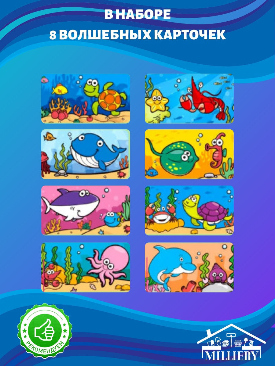 Водная раскраска-карточка для малышей увлечет вашего ребенка, подготовит руку к письму и рисованию. Раскроет творческие способности ребенка. В наборе 8 карточек для рисования. В комплекте идет маркер, который необходимо заполнить водой. После высыхания ка