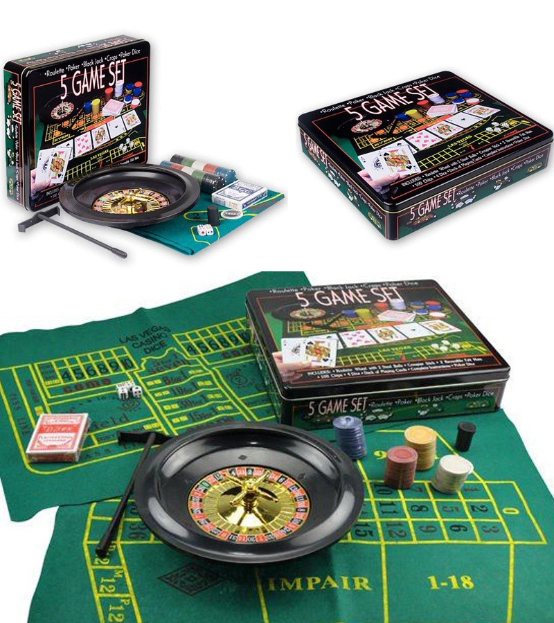 Комплектация:В набор "Казино 5 в 1" входят:• колесо рулетки• 2 стальных шарика• стик крупье• 2 коврика зеленого сукна с полями для всех игр• 100 фишек (4-х цветов по 25 шт)• 4 игральные кости• набор игральных карт• жестяная коробка – ящик для храненияОп