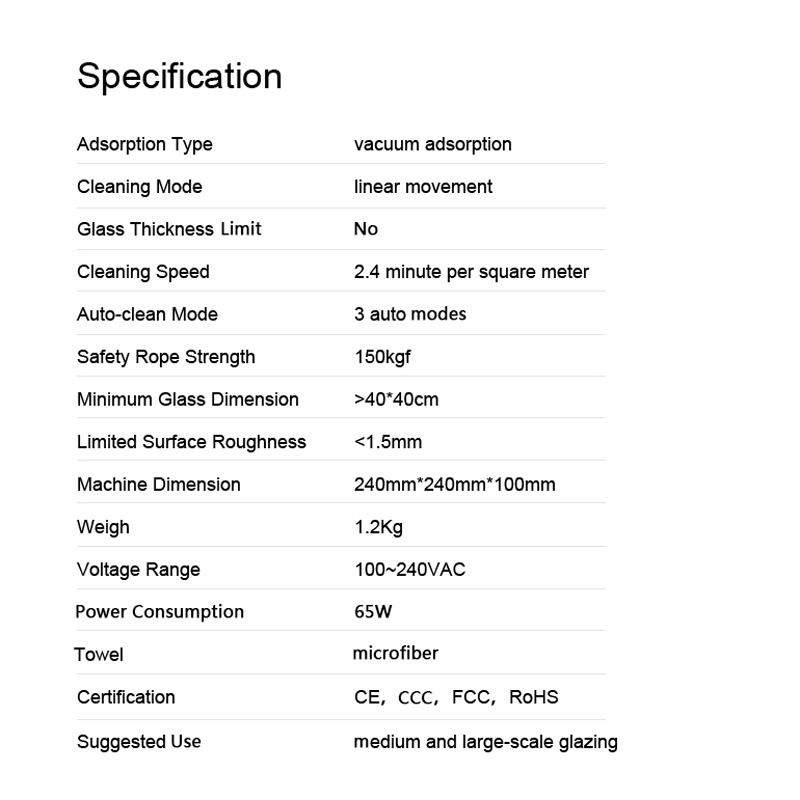 Описание:1. Робот для мытья окон LIECTROUX X6 предназначен для мытья высоких окон снаружи, замены опасной человеческой работы 2,4 мин / квадратный метр, окно 2 м * 1 м.Занимает около 10 минут в автоматическом режиме. Работает автоматически, 3 способа очис