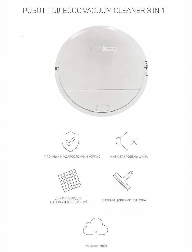 Комплектация:Робот-пылесосПара щетокТкань для протирки полаUSB шнурКонтейнерЗаглушка для передних колесОписание:Робот пылесос с возможностью сухой и влажной уборки. Простой в использовании пылесос предназначен для уборки полов с различными видами покрытия