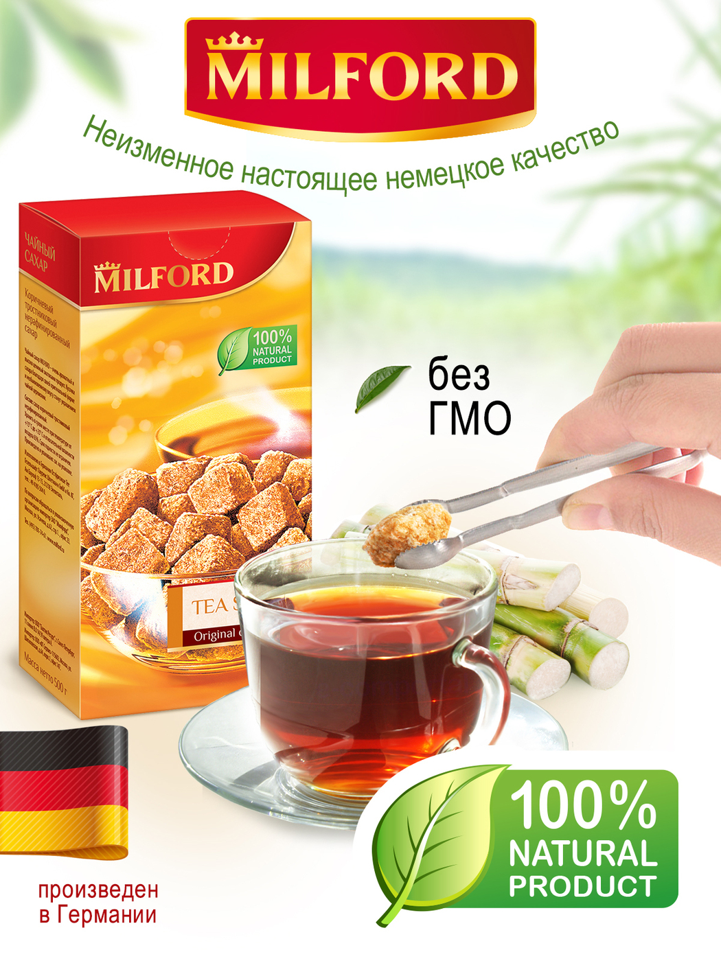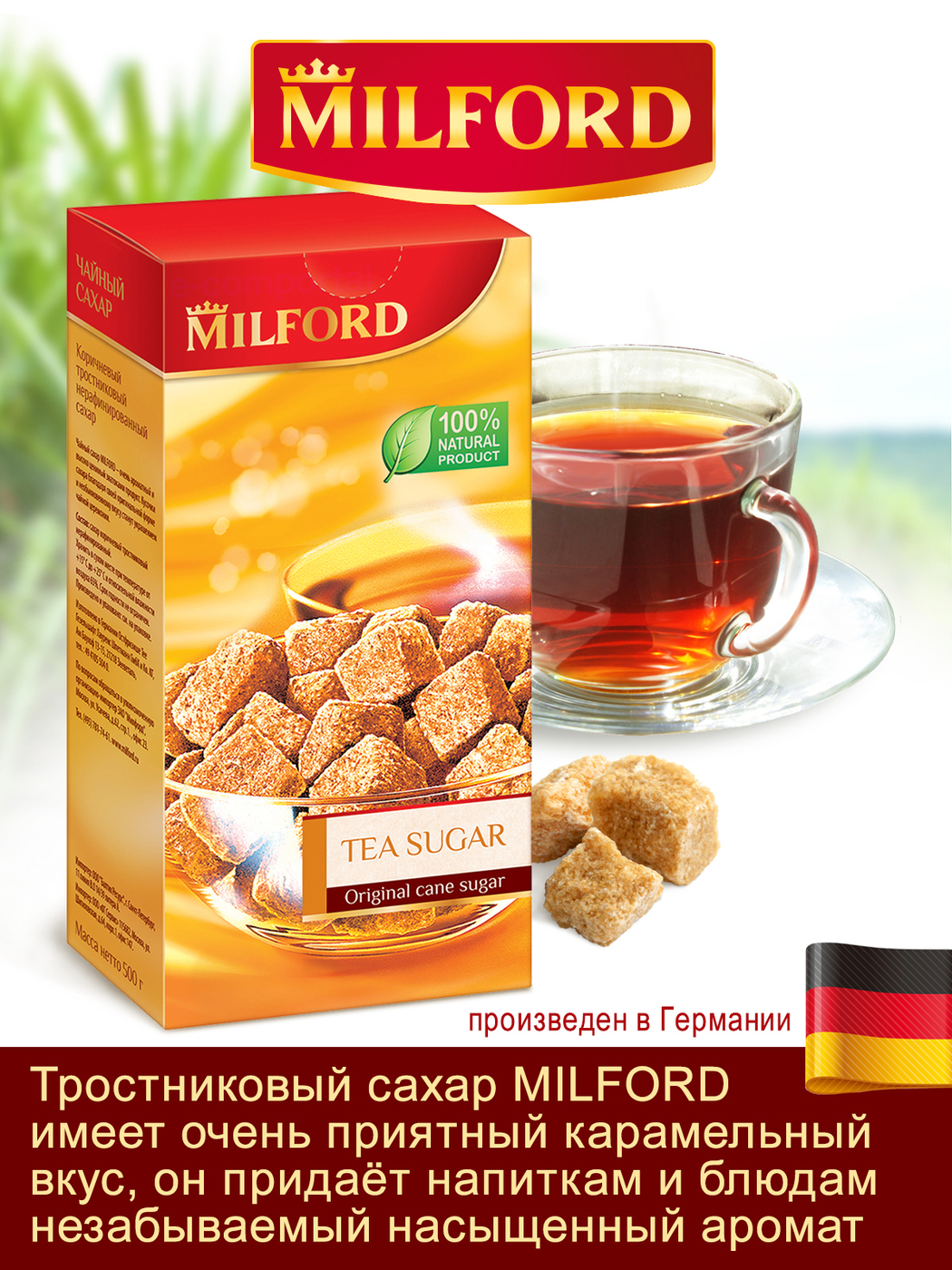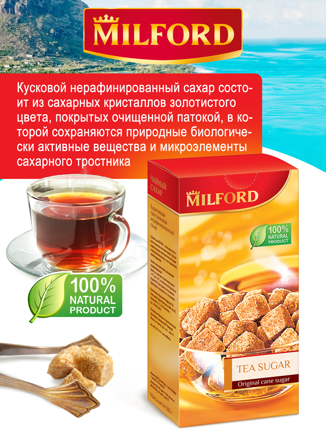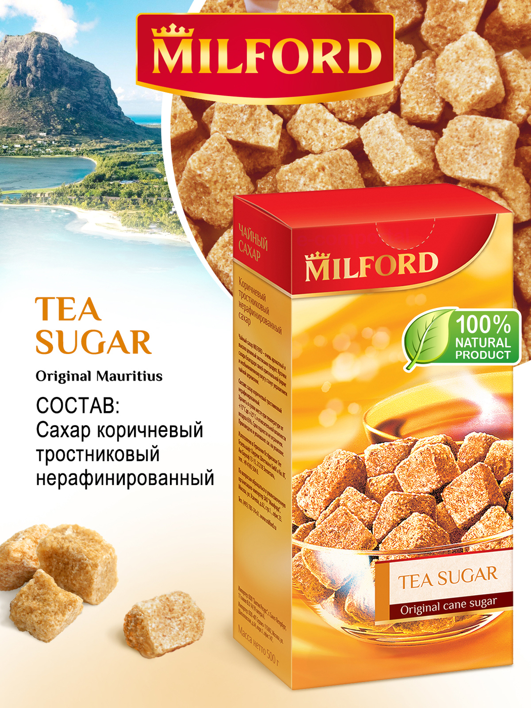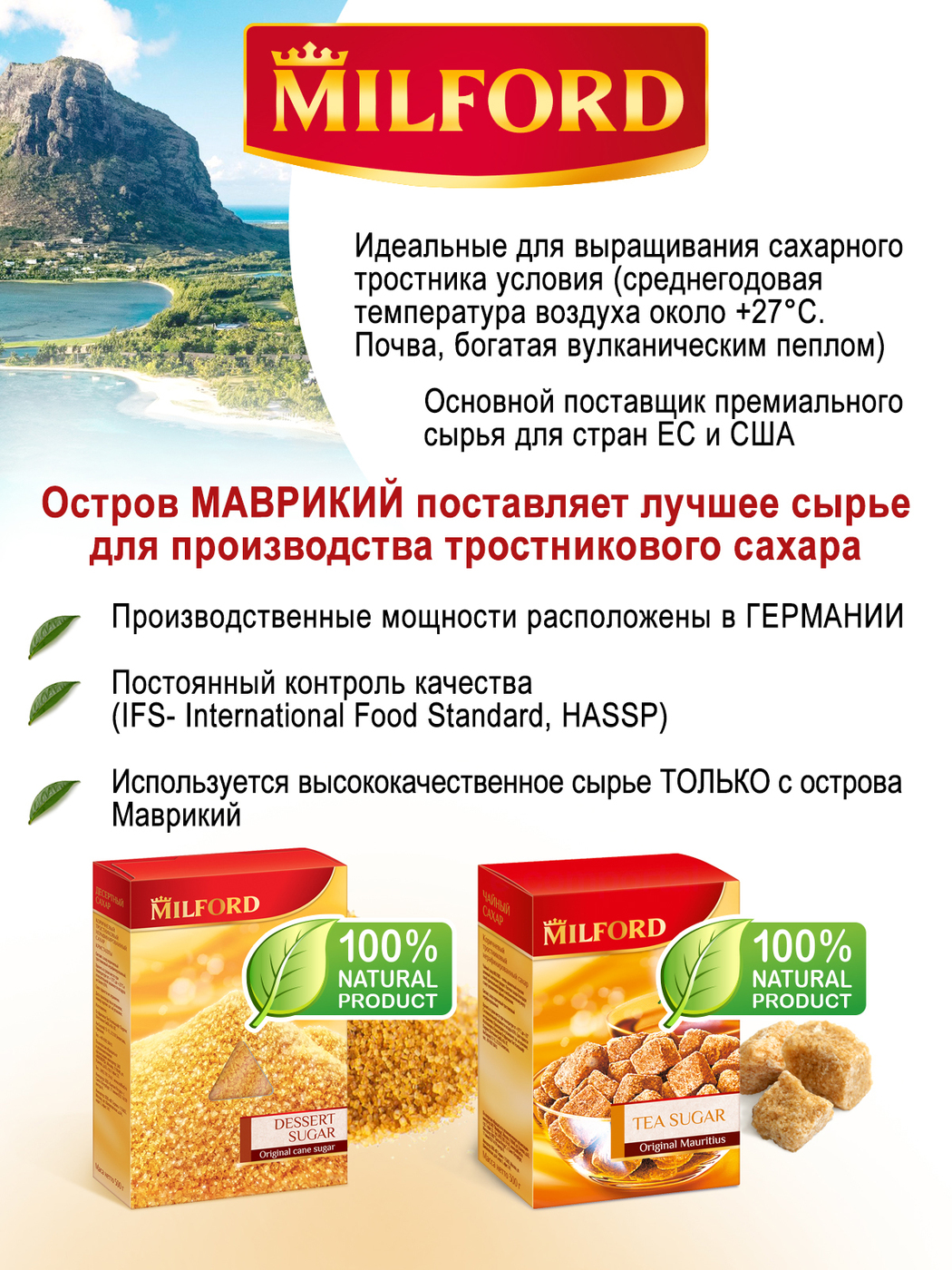 Тростниковый сахар Милфорд Чайный.Тростниковый сахар - сахароза в виде кристаллов, пропитанных тростниковой патокой, полученная из сахарного тростника. Сырьем для производства является сахарный тростник с острова Маврикий. На этом острове созданы идеальн