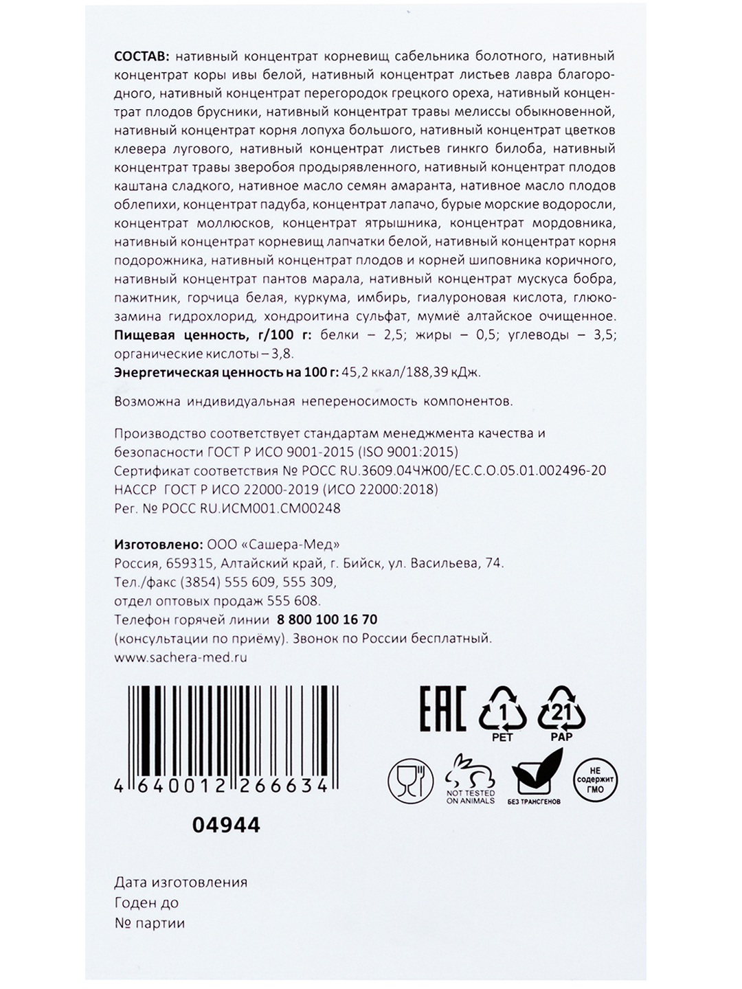 Состав:мускус бобра;клевер;гинкго билоба;куркума;лавр;сабельник;кора ивы;лопух;алтайское мумиеСпособ применения:После вскрытия ампулы-контейнера необходимо употребить содержимое в течение 10 минут для получения максимального терапевтического эффекта. Для