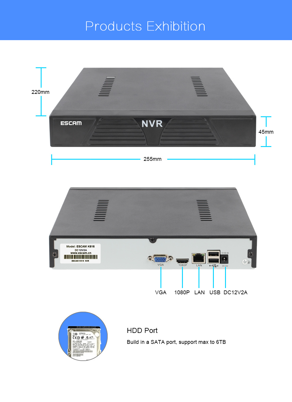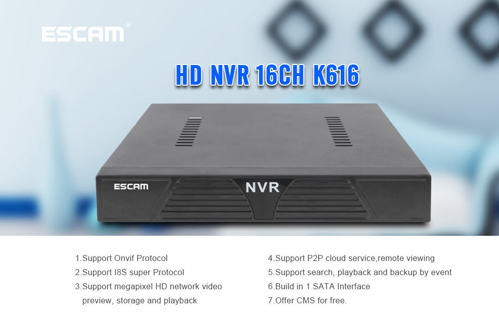 Партномер: ESCAM IP NVR K616 Операционная система: Операционная система: встроенная операционная система LINUXКод изображения Управление: Качество кода изображения регулируется. Переменный битстрим и постоянный битстрим опциональноDual Stream: Каждый кана