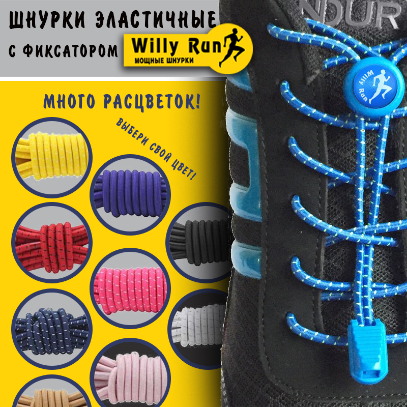 Комплектация:Шнурок 120 см - 2 шт, Кнопка-фиксатор - 2 шт, Клипса - 2 штОписание:Эластичные шнурки Willy Run помогут обуться за секунду! Шнурки с фиксатором не требуют завязывания и развязывания. Регулируемые шнурки не развязываются во время ходьбы и бега