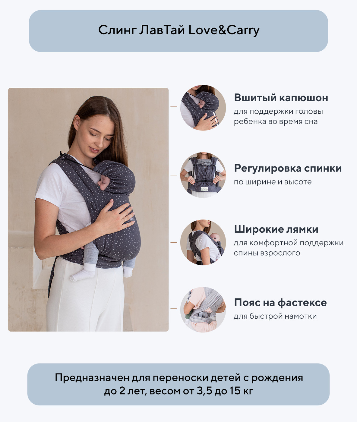 Особенности рюкзаков/слинговВсесезонный, Поддержка родительской спины, Регулируемая длина ремня, Регулировка положения ножек малыша, Страховочные резинки, Мягкий подголовник, Удлиняющаяся спинка