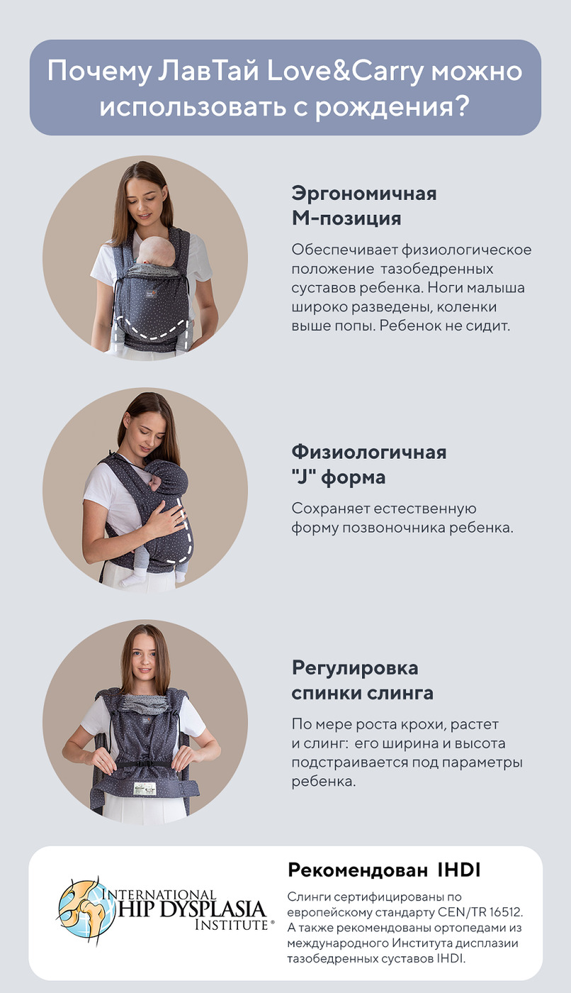 Комплектация:Слинг шарфомай. Детальная инструкция с фотографиями. Цветная картонная коробка.Описание:Слинг Лавтай - легко регулируемый и простой вариант для новорожденного малыша. По мере роста крохи, растет и слинг: его ширина и высота подстраивается под