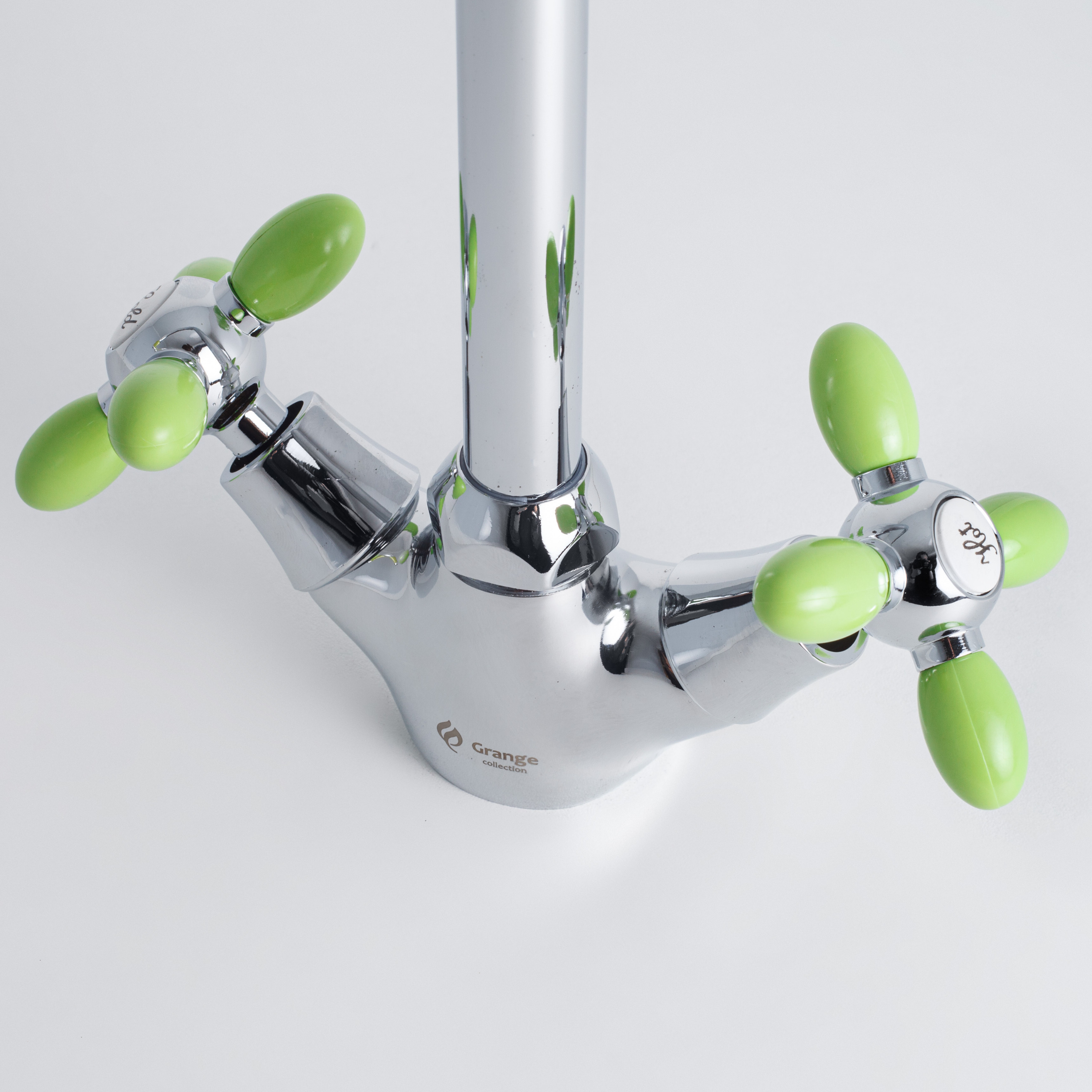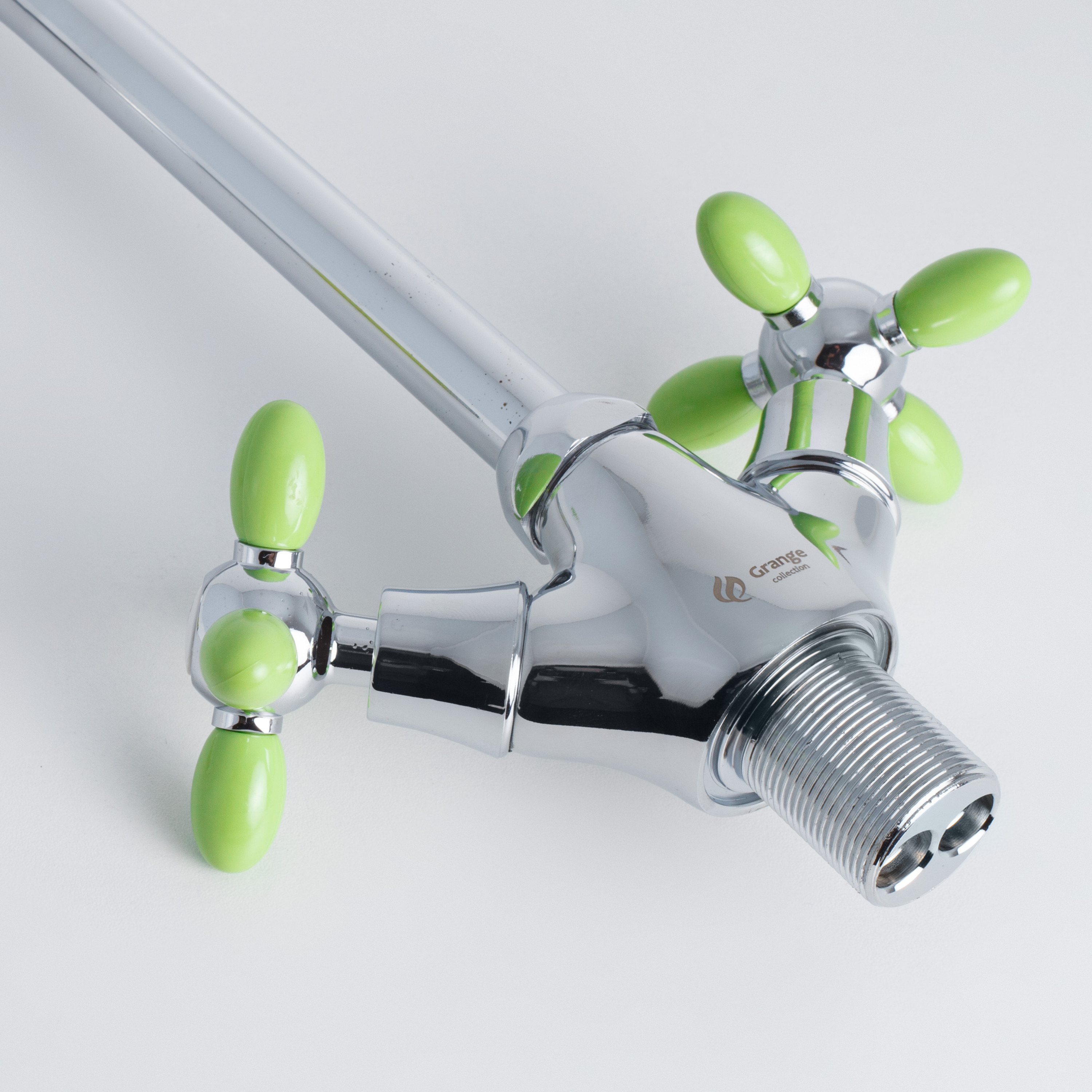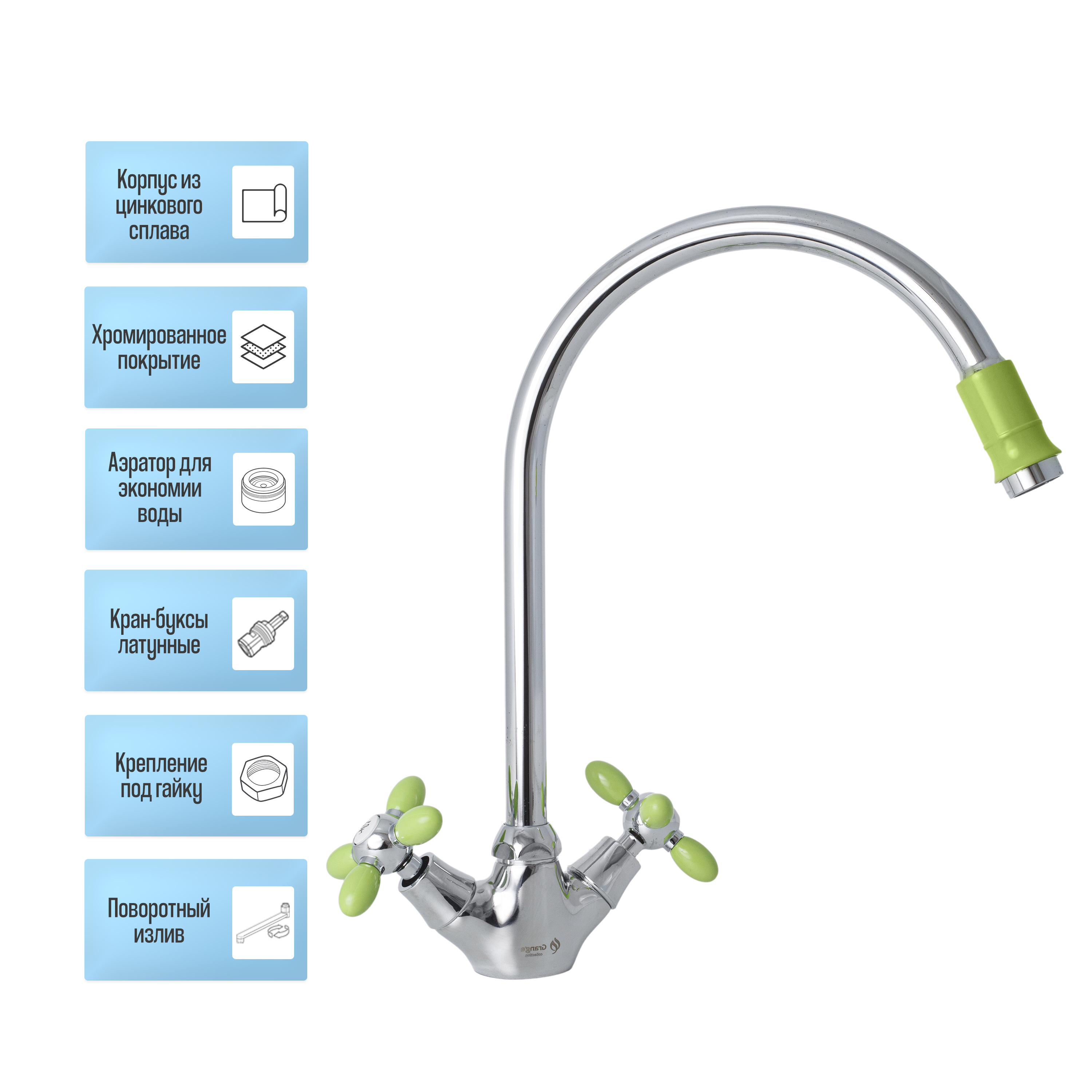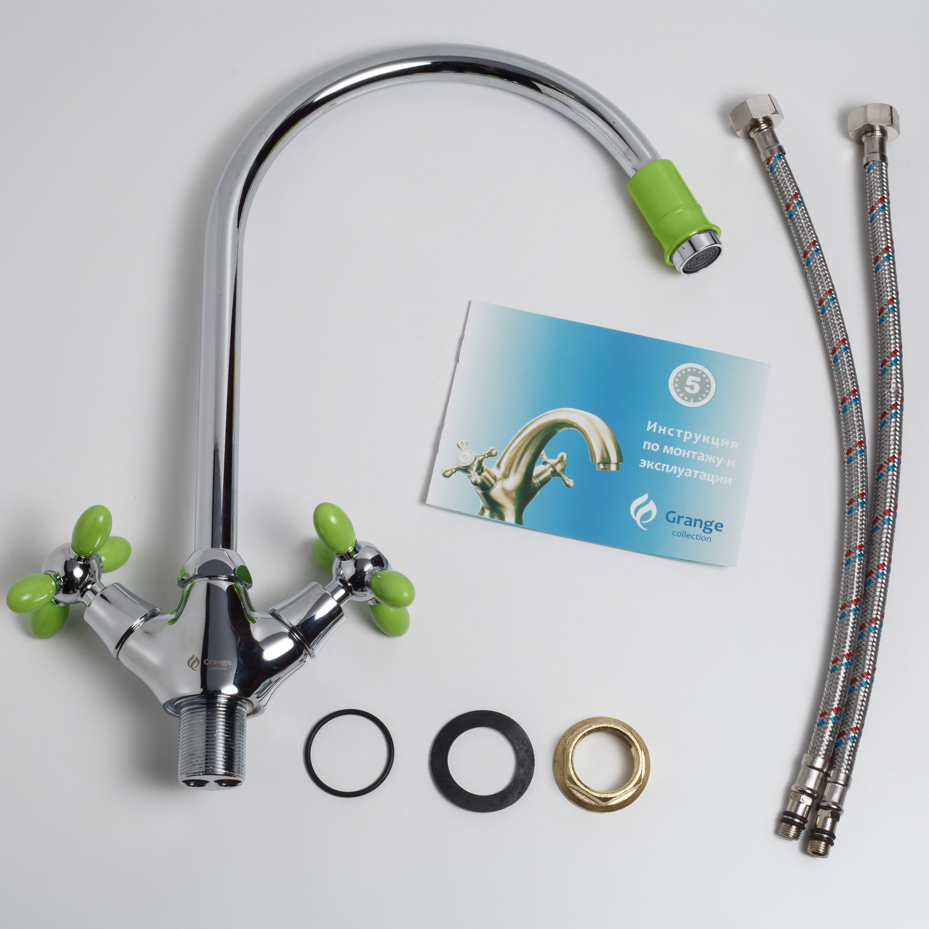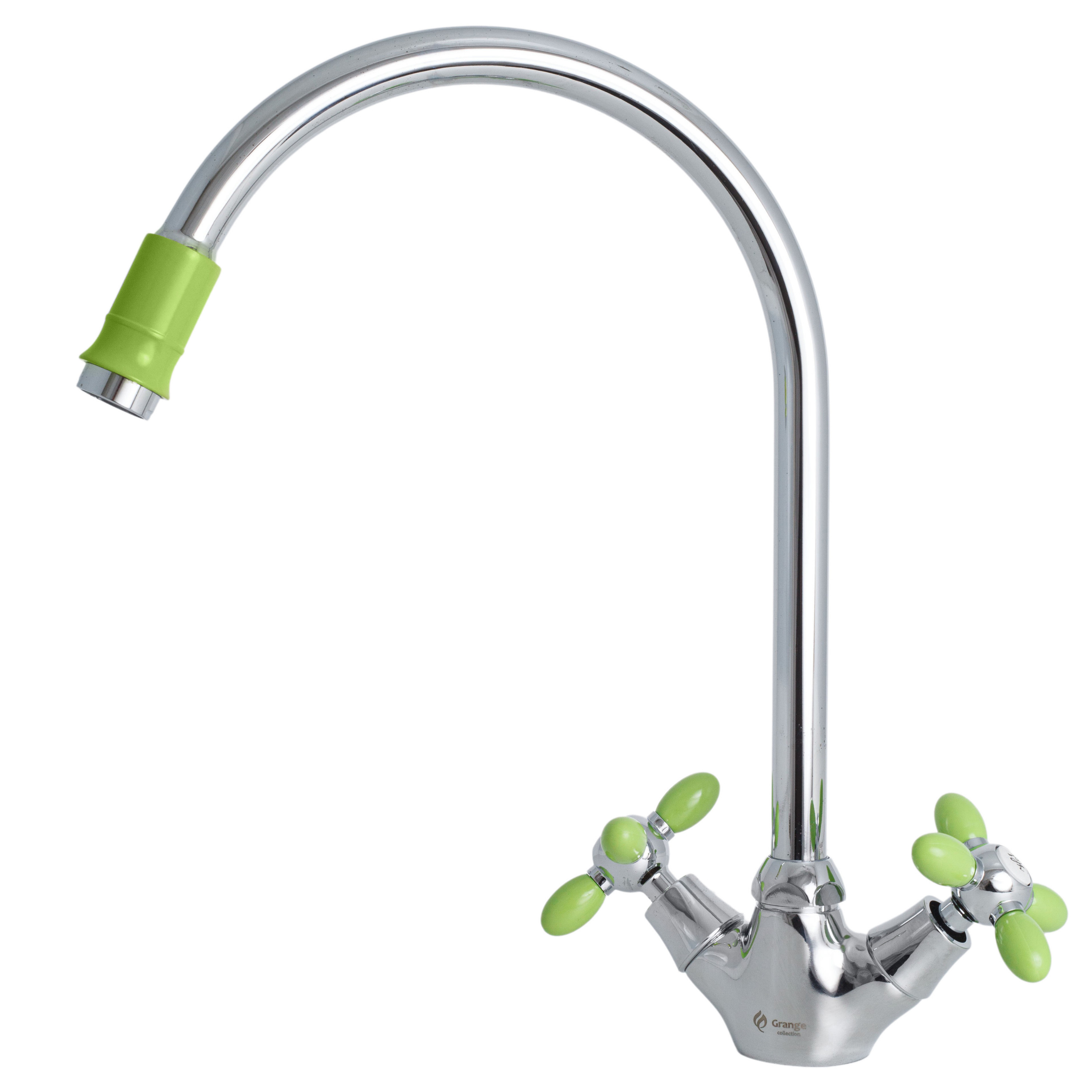 Комплектация:Смеситель 1 шт., гибкая подводка 2 шт., крепежная муфта 1 шт., гайка 1 шт., монтажный комплект 1 шт., паспорт изделия 1 шт.Описание:Смеситель для кухни под гайку Grange. Цвет Серебристый +Зеленый. Арт.7022763LC-M7156 Код 13073GRANGE- это лако