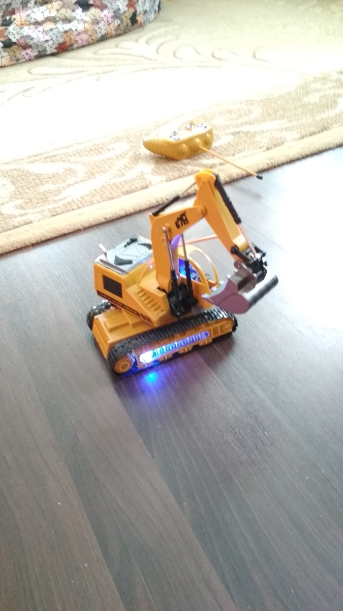Размер экскаватора: 35х15 см. Функции: езда вперед и назад, копает, поворачивает налево и направо, вращение экскаватора на 360 градусов, кабина крутиться (от руки), движение стрелы вверх и вниз, мерцающая подсветка на гусеницах и в кабине, металлический м