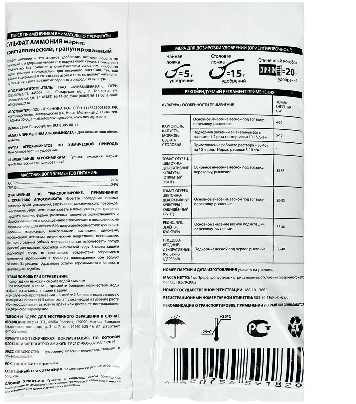 Сульфат аммония — является высокоэффективным азотным удобрением, применение которого обеспечивает высокую агрономическую эффективность.Особенно хорош для весеннего внесения, так как большое количество азота, входящее в его состав, помогает интенсивно подс