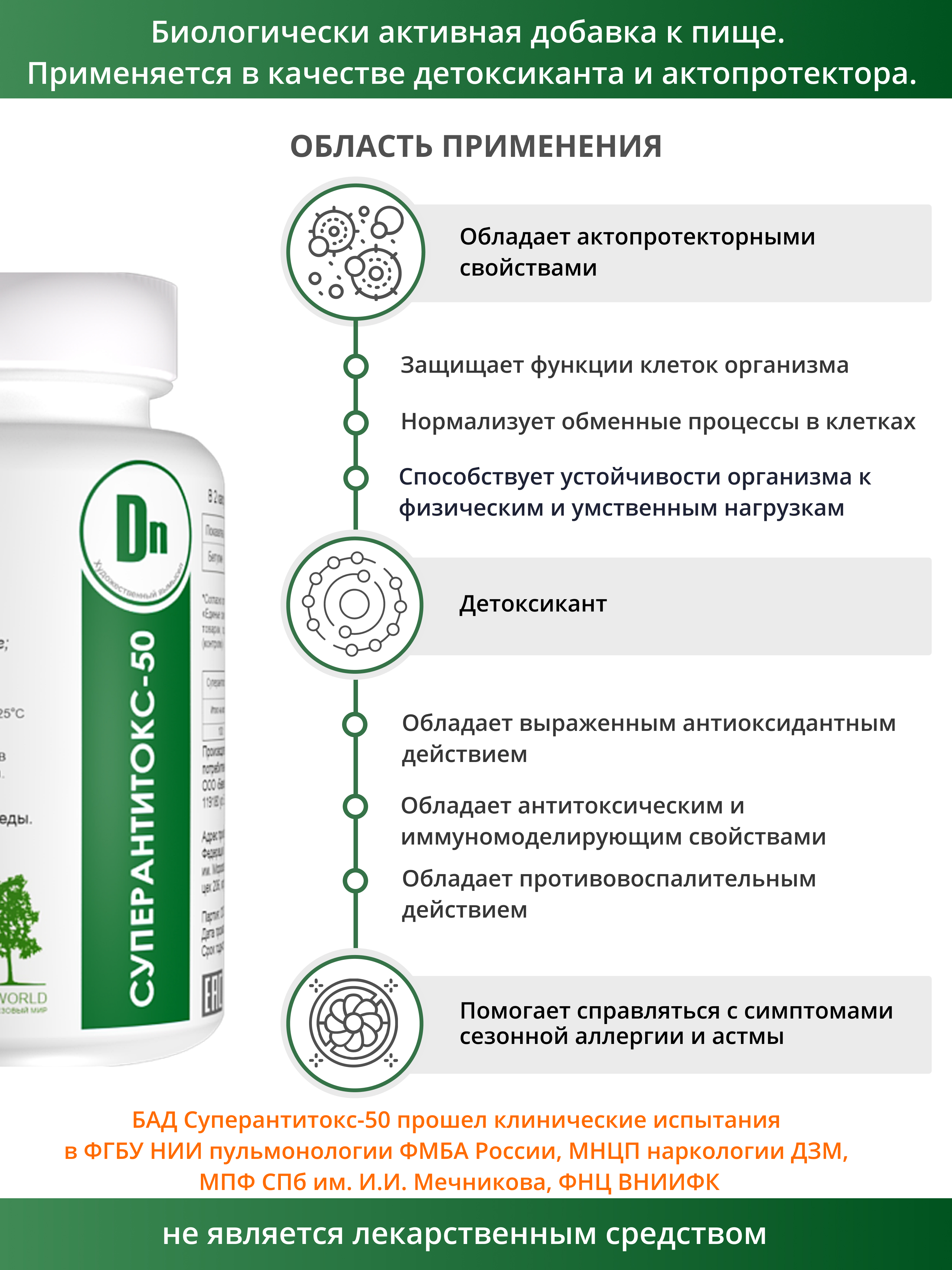 Суперантитокс-50 - Биологически активная добавка к пище. Применяется в качестве детоксиканта, актопротектора и адаптогена. Обладает выраженным антиоксидантным, антитоксическим и иммуномодулирующим действием. Нормализует обменные процессы и помогает справл